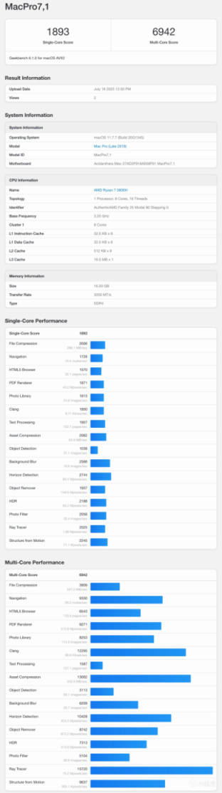 一切正常,系統整體流暢度很不錯。但性能上多少還有一些損耗,又跑了一次Geekbench 6.1.0,單核1893,多核6942。