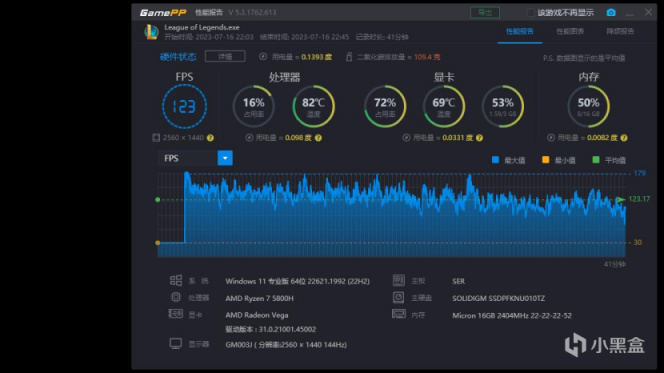 最後來個輕鬆的40分鐘LOL英雄聯盟,這次壓力就小多了,平均123fps小問題,平時消遣消遣開一把都是比較流暢的。