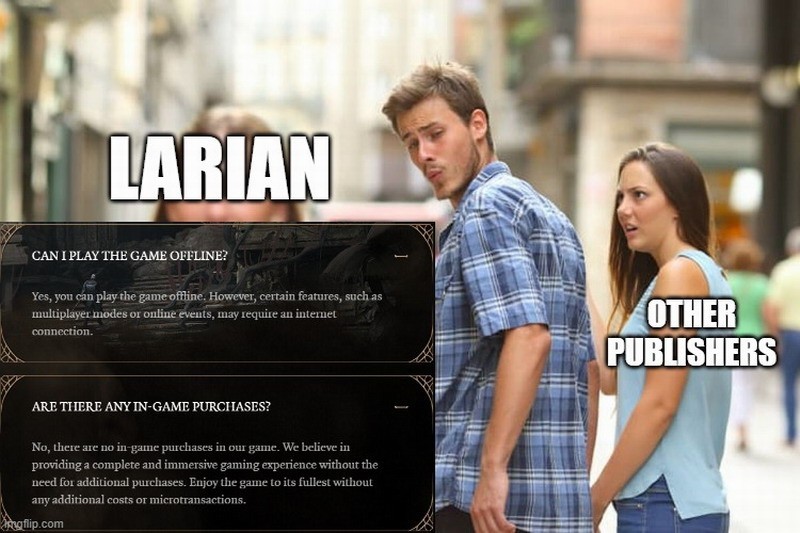 近日国外Reddit论坛上有人发帖附图,很好地表达了人们对这款可以离线游玩的单人RPG的赞赏。而且《博德之门3》没有微交易,让玩家不用拿真金白银去购买皮肤。