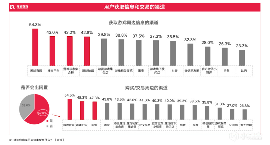 對於消費者來說,獲取信息的渠道主要集中在遊戲官網、社交平臺、遊戲玩家集合羣和遊戲論壇。同時,超過6成的消費者表示會出售閒置的周邊,購買和交易平臺中,遊戲官網、遊戲論壇和閒魚是主要的交易場所。