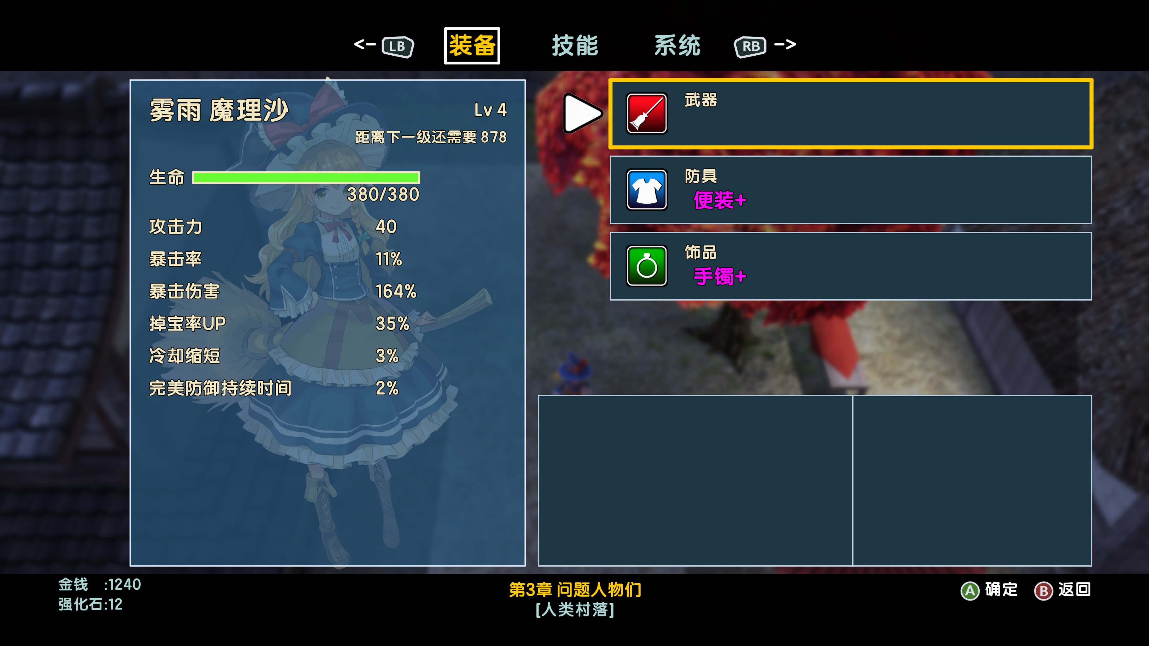 同时角色可以装备3个物品,武器、衣服、饰品,游戏中装备是打怪或者宝箱随机掉落,属性也是随机,随机的值是在这个装备的范围内,同时解锁装备锻造的话可以在铁匠处重铸装备,但是重铸装备属性用处不大,因为很可能会把你想要的属性洗低了,而且属性很随机,同时打野怪掉落的装备也随机,这就导致了铁匠这边如同虚设了。