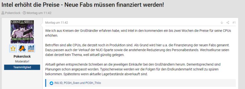 Pockerclock聯繫了兩間德國供應商,證實英特爾信中提到漲價一事:
