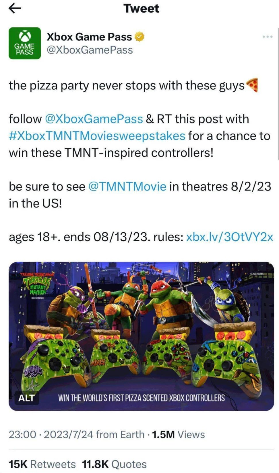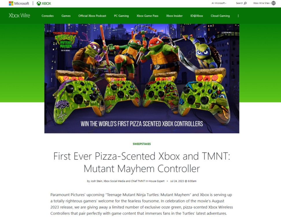 因此,Xbox本次便为忍者神龟四人组设计了一款“有史以来的首个披萨味”手柄,在空气中弥漫的披萨味中体会到神龟们的快乐