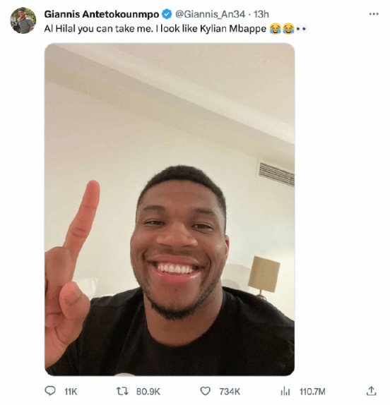 字母哥在社交媒体上调侃:“利雅得新月,你可以签我。我长得有点像姆巴佩。”姆巴佩则回应了13个哭笑不得的表情……