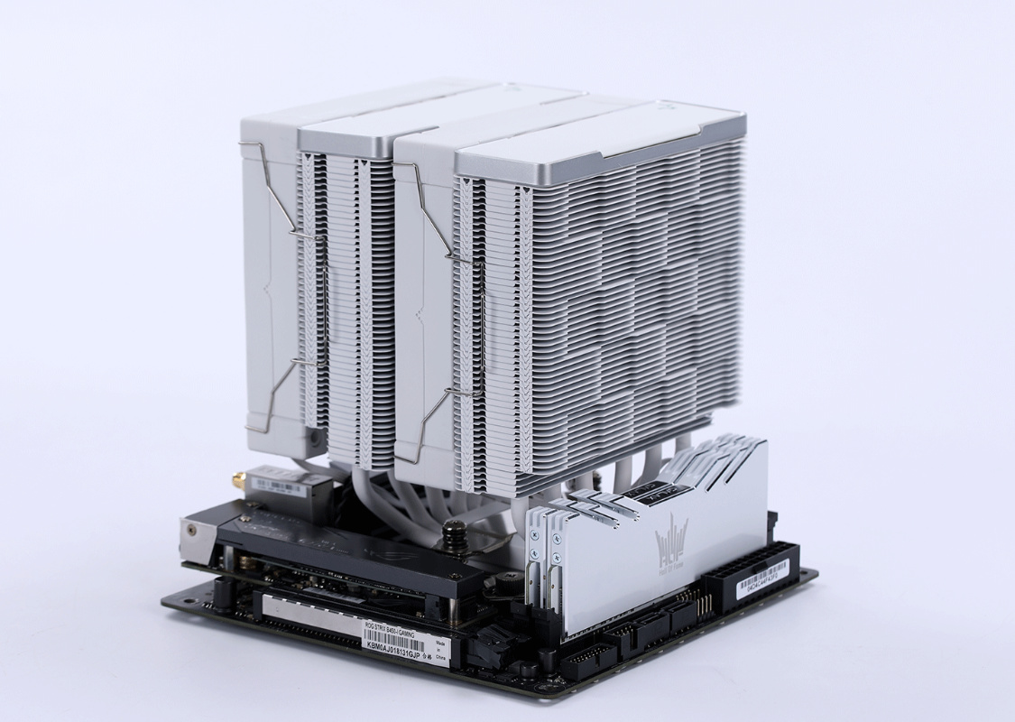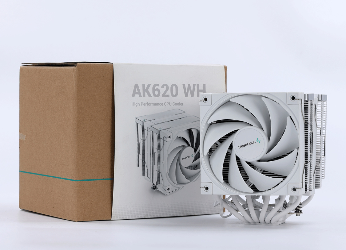 散热器也用的我的库存,九州风神AK620白色双塔风冷,整体纯白的配色,搭配上独特的矩阵式鳍片组和网格装饰顶盖,棱角分明的外形线条,质感与颜值表现都十分优秀。风冷标配2把白色无灯FK120风扇,风扇搭载了高转速静音FDB轴承,使用寿命长噪音低,同时还可以根据系统负载动态调节转速,在风扇四角软质包胶的加持下,风扇满载运行的噪音仅为28dB(A);