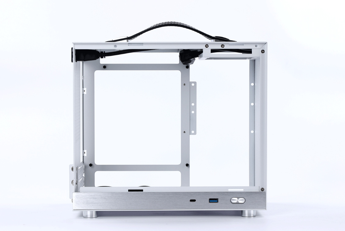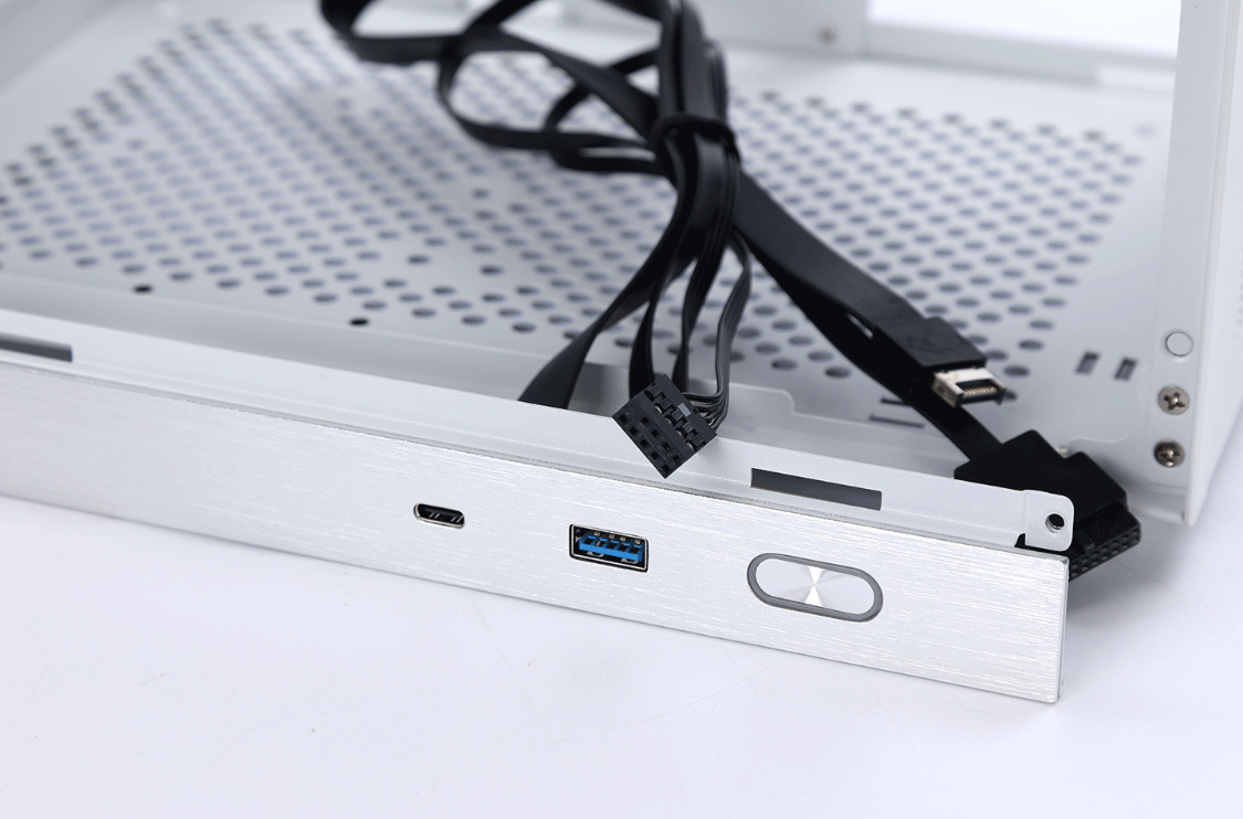 I/O面板位于机箱侧面底边处,铝合金材质的I/O面板采用了金属拉丝表面处理工艺,质感表现优秀,I/O接口则提供了1个USB 3.0、1个USB 3.0 Type-C 10Gbps数据接口以及1个开机电源键。电源键周围还有一圈灯带环绕,一体式的开机跳线也避免了装机时一根根往主板上接线的繁琐;I/O面板采用了可拆卸式设计,便于显卡安装。