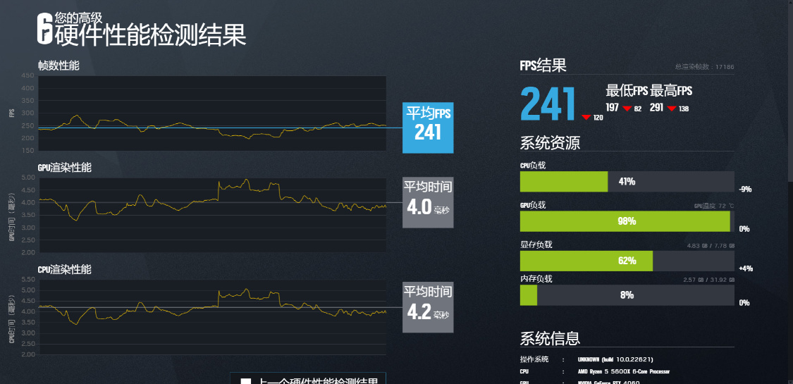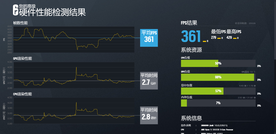 《彩虹六号·围攻》基准测试,画质超高,2K分辨率下,游戏平均帧率为241FPS,1080P分辨率下,游戏平均帧率为361FPS;