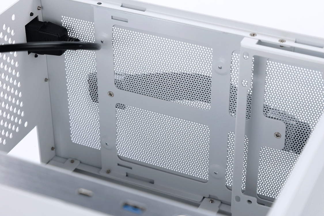 全机身都采用了Mesh网孔面板设计,细密的网孔既能保证机箱内部优秀的散热效率,还能防止迅速积灰。内部模块化设计通过螺丝固定,对DIY玩家非常友好。