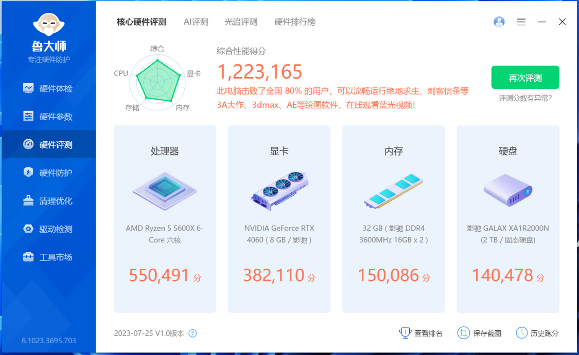 鲁大师整机测试,整机得分122W分,CPU得分55W分,显卡得分38.2W分;