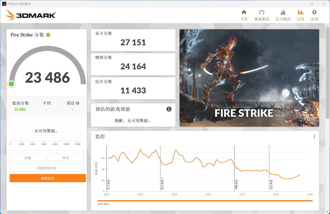 Fire Strike显卡DX 11性能基准测试,显卡得分27151分,物理得分24164分;