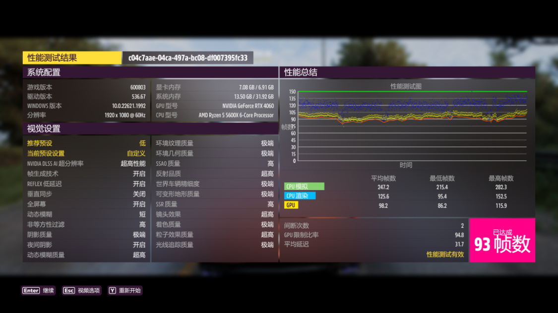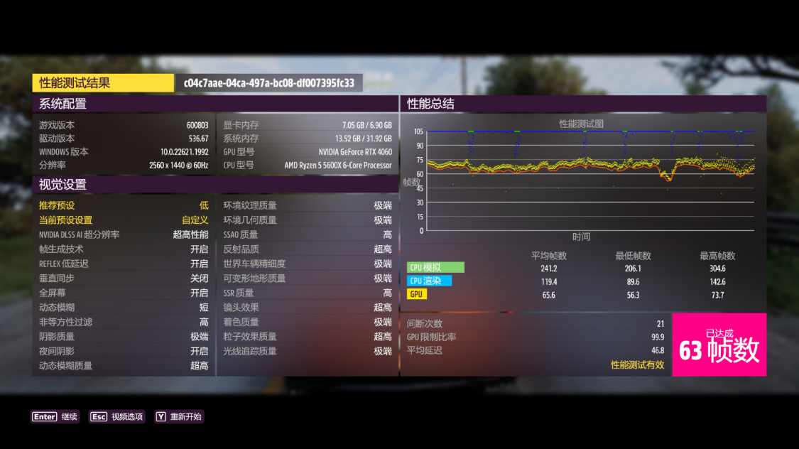 《极限竞速·地平线5》基准测试,极端画质,光追极端,DLSS超级性能,并开启DLSS 3.0,2K分辨率下,游戏平均帧率为63FPS,1080P分辨率下,游戏平均帧率为93FPS;
