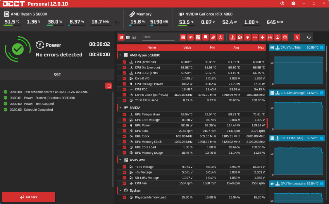 OCCT双烤测试,默认设置下,烤机30Min,CPU平均温度63.23°,CPU平均功耗77.73W,显卡平均温度69.23°,显卡平均功耗114.44W左右,整机功耗为190W左右;