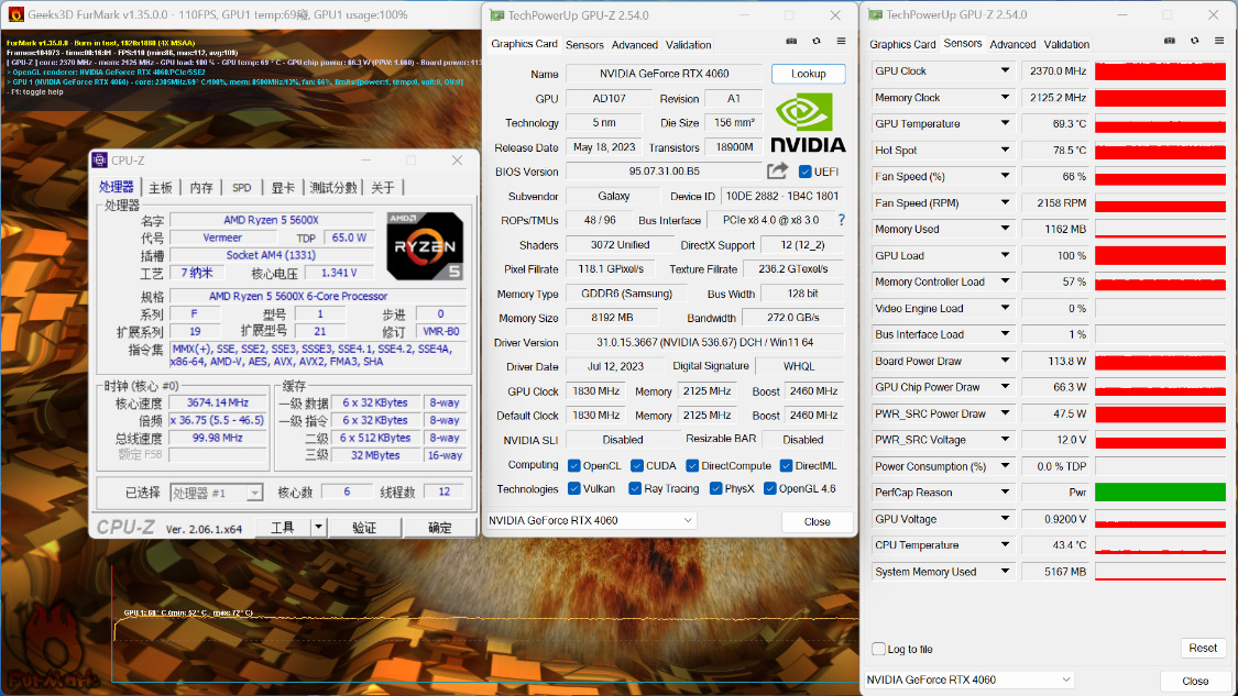 FurMark显卡烤机测试,机箱内环境,烤机15Min,显卡温度为70°左右,显卡功耗为115W左右;