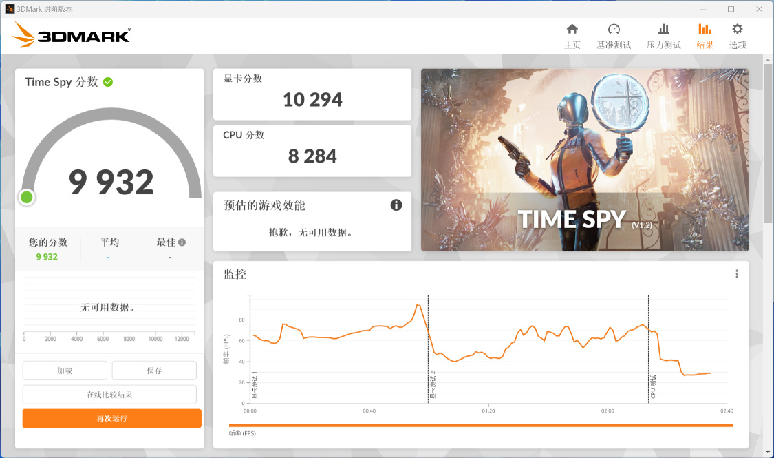 Time Spy显卡DX 12性能基准测试,显卡得分10294分,CPU得分8284分;