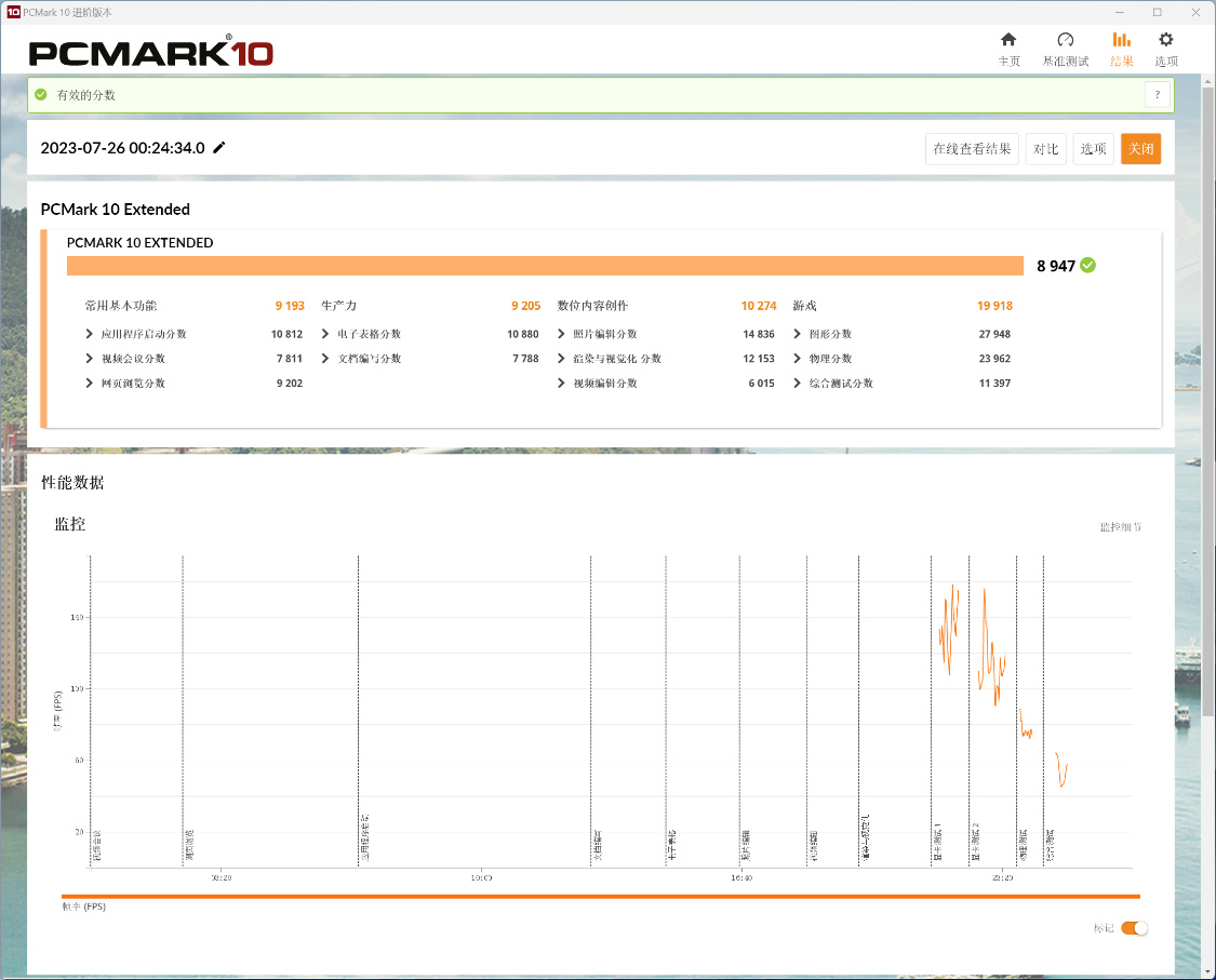PC Mark Extended整机测试,整机得分8947分,常用基本功能得分9193分,生产力得分9205分,数为内容创作得分10274分,游戏得分19918分;