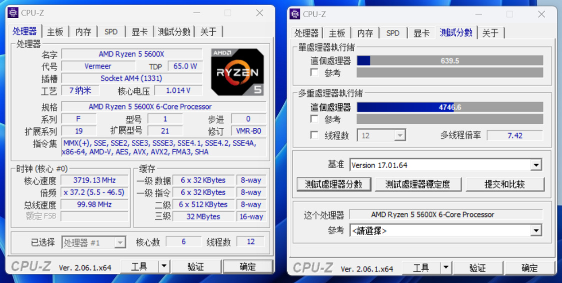 CPU-Z基准测试,单核得分639.5分,多核得分4746.6分