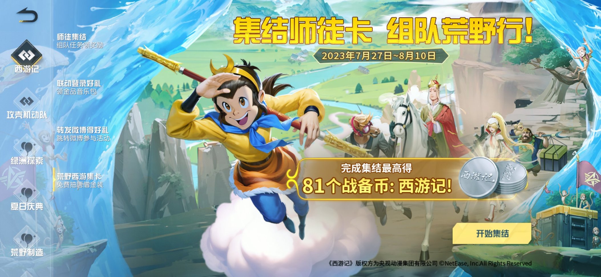 就在今天(2023/7/27)荒野行动居然联动了99动画版西游记,我记得我还在幼儿园的时候,一到下午就守在电视机前守着,开头那几个3D的圆球转动着,响亮的OP响起:猴哥猴哥,你真了不得~