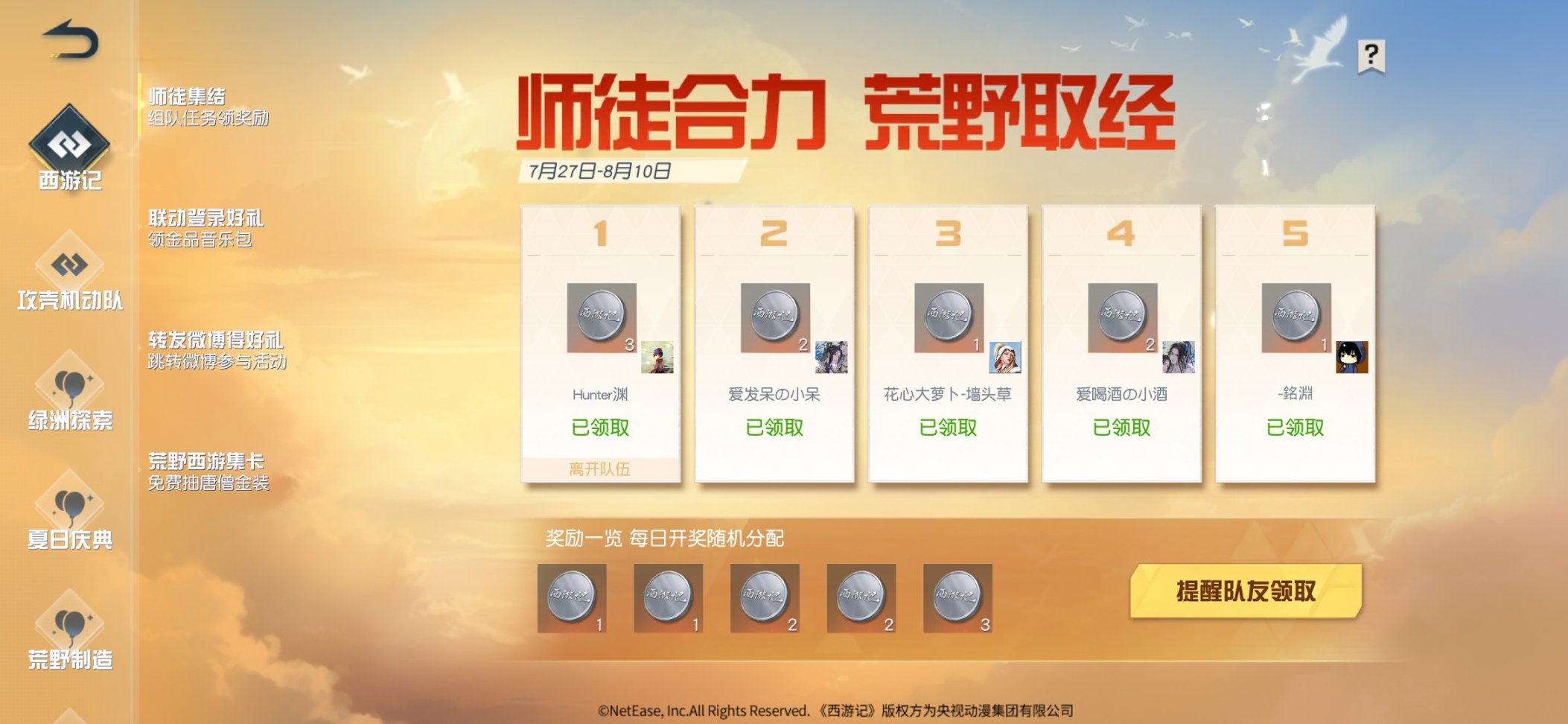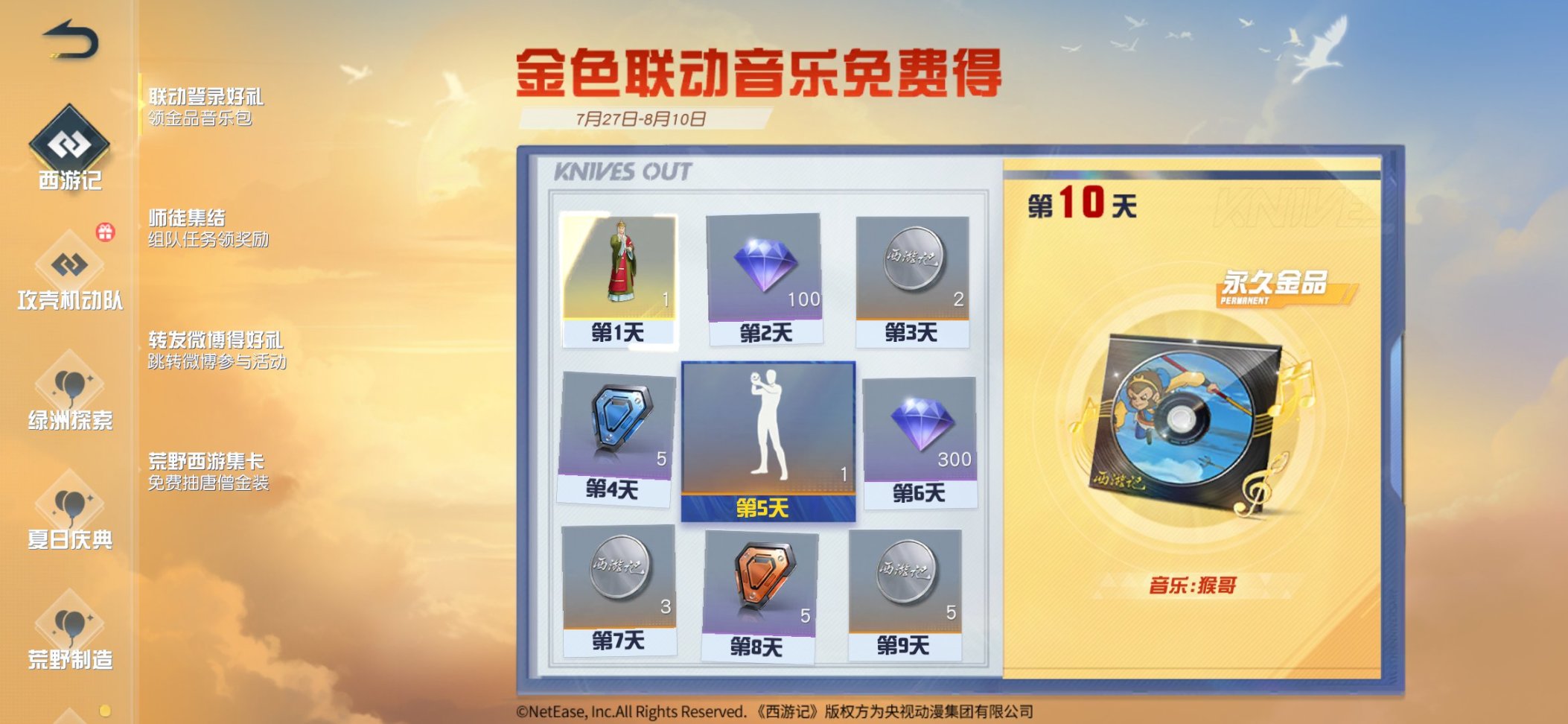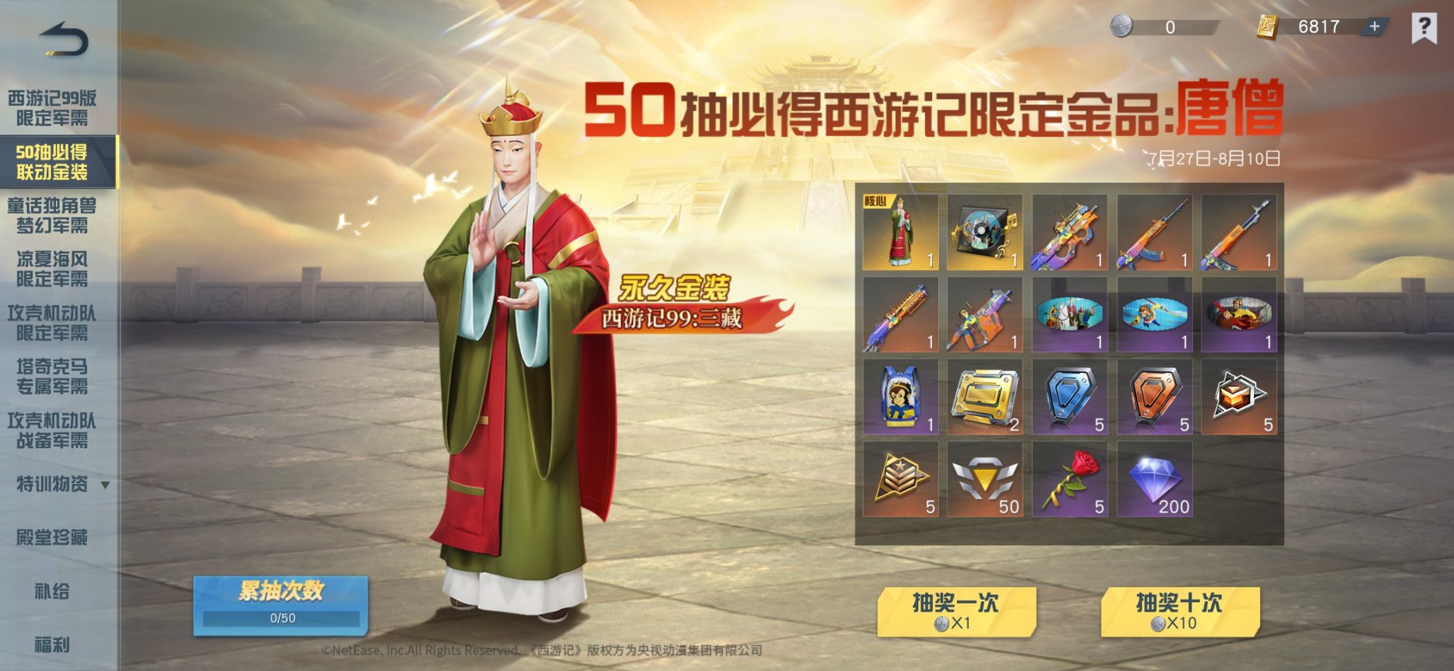 第一天签到送的唐僧是1天的体验卡,但是这个50抽保底是可以通过活动免费获得的,除了唐僧之外还有的片尾曲可以作为荒野游戏内的BGM,签到十天还会送那首经典的主题曲。