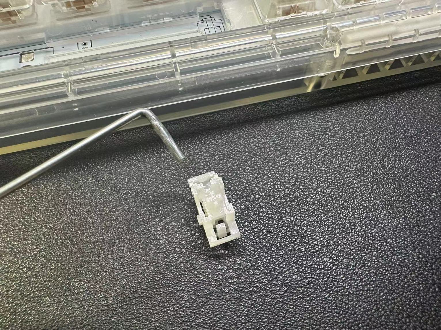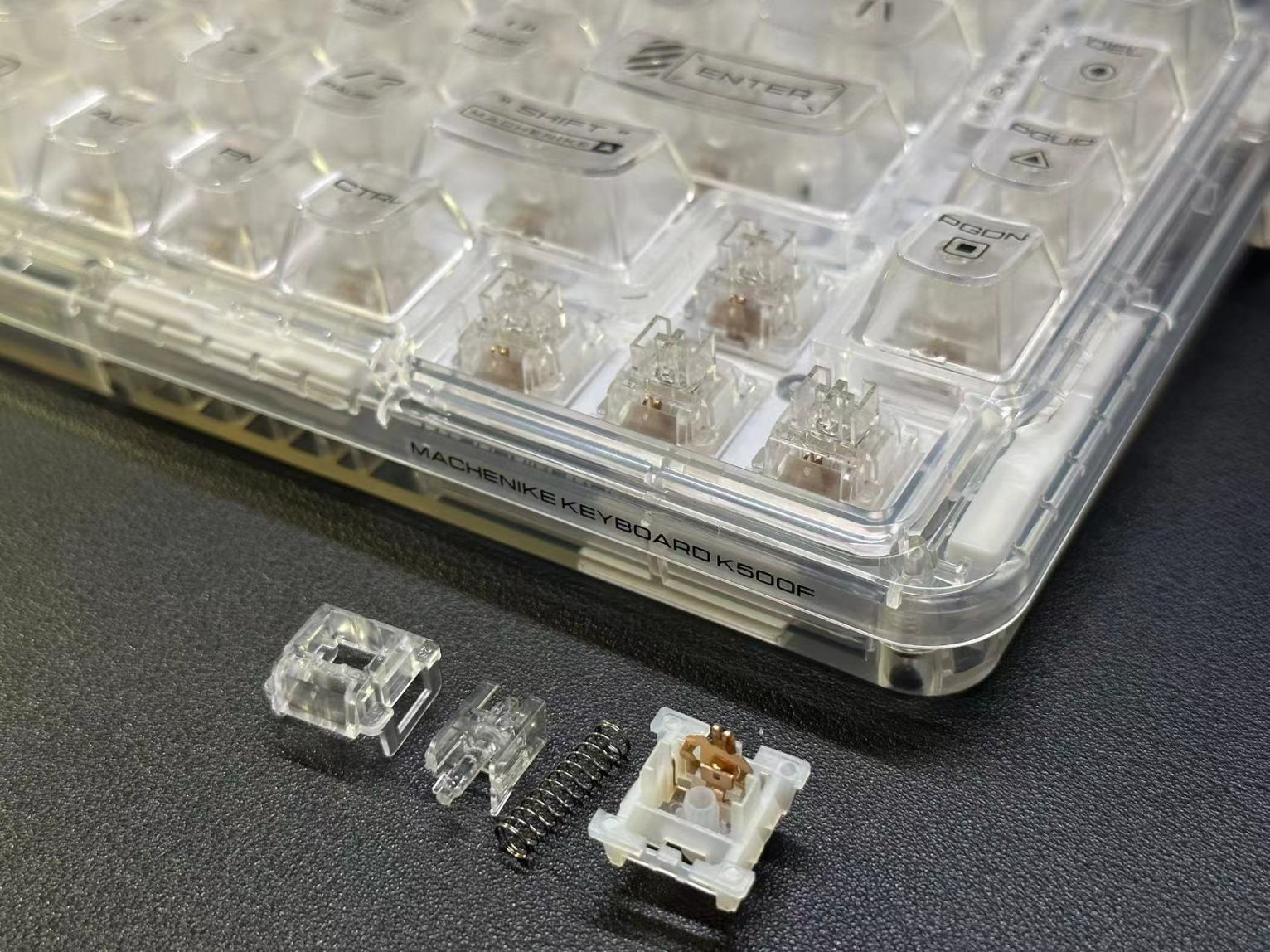 K500F的轴体采用冰芯轴和冰莹轴2个版本,我手上的是冰莹轴所以也就说说这个轴体吧。轴体上盖和轴芯都是采用pc材质,底壳缺没有做透有点小可惜了。整体润滑情况,在小爪和侧壁是给润滑,弹簧的底部也是做了润滑处理。但是这个轴体到手整体顺滑程度可能不是那么理想,在侧边按压会给人一种挤挤的感觉,但是价格来说的话也就说得过去了。