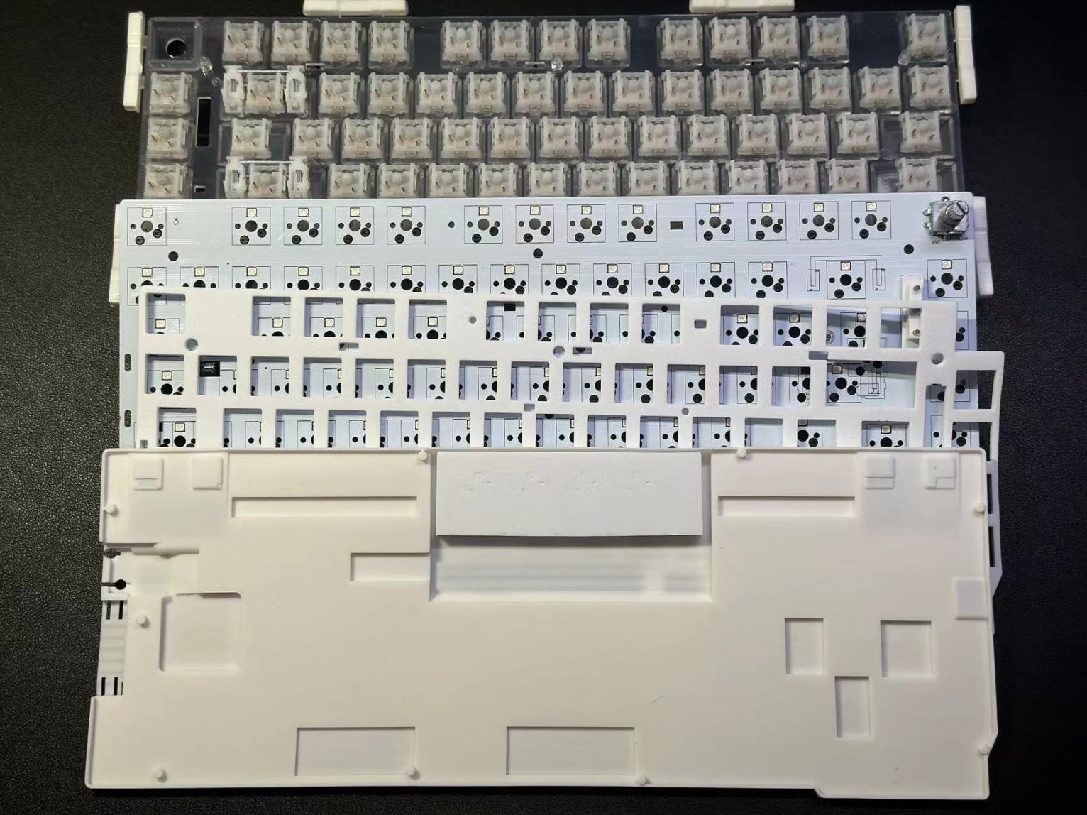 - PCB板:采用的是白色上灯位板本,支持3脚/5脚热插拔,但是还是那个问题上灯位对于侧刻键帽来说不是很友好。