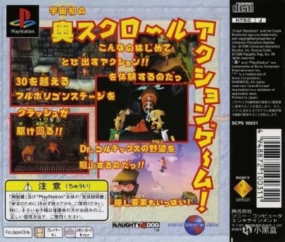 本作是PS主機動作過關遊戲的代表,玩家扮演名叫Crash的袋狼,爲了給妹妹的筆記本電腦充電,深入叢林尋找能源水晶,無意發現了科爾特斯博士試圖統治世界的陰謀,於是在博士的實驗島上與各種敵人展開了冒險。遊戲關卡任務很明確,就是要收集到水晶然後到達終點,而關卡類型則包括了橫版動作、追尾動作、賽車、空戰等,在當年3D遊戲技術並不發達的環境下,頑皮狗打造出了遊戲獨特的視角,給玩家帶來了電影化的流暢體驗。