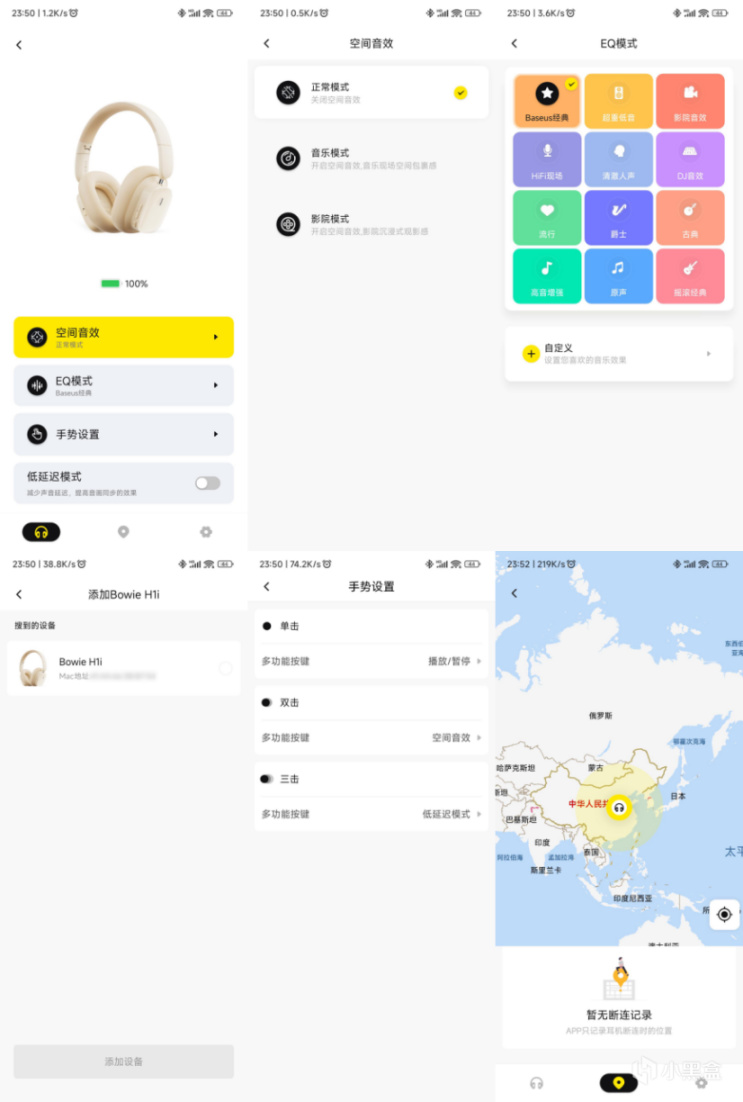 App可以更加直觀的設置空間音效、選擇或自定義EQ,可以在手勢設置中設置多功能按鈕功能,App還會記錄耳機最後斷連的位置,便於尋找耳機。
