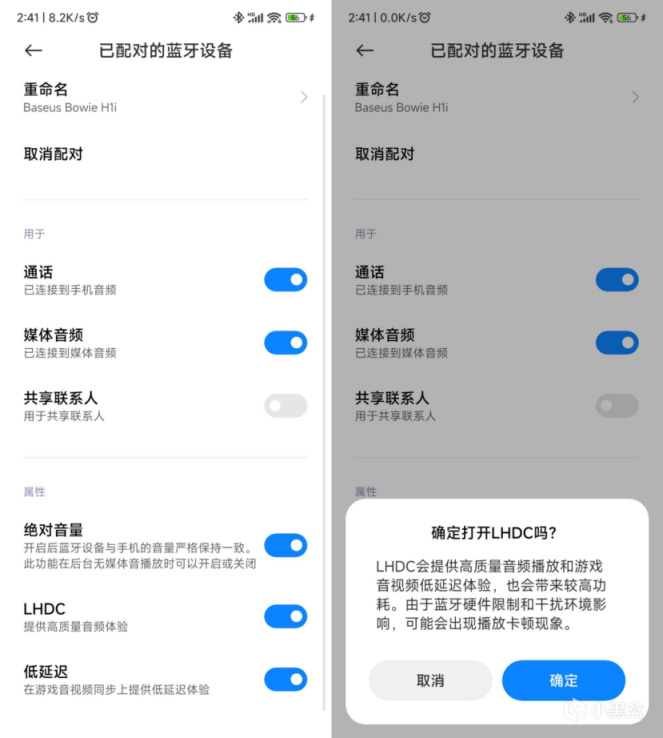 連接上支持LHDC協議的手機之後,從手機藍牙連接頁面便可以開啓切換到這一協議,正如手機對這一功能的簡介,LHDC協議相比之下會增加耗電,但可以獲得更好的音質和更低的延遲。