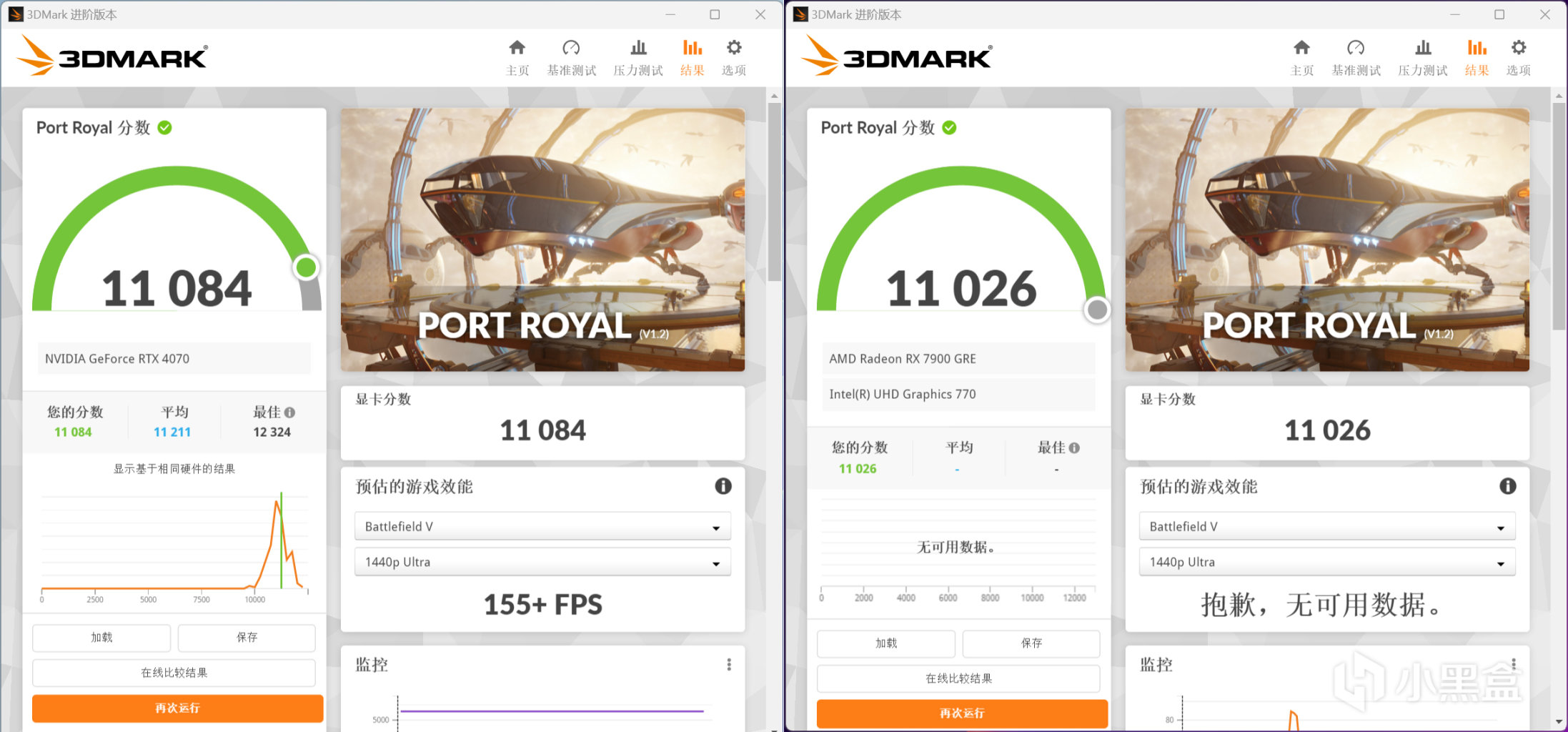 3DMark PORT ROYAL跑分,RTX 4070顯卡分數爲11084,RX 7900 GRE顯卡分數爲11026