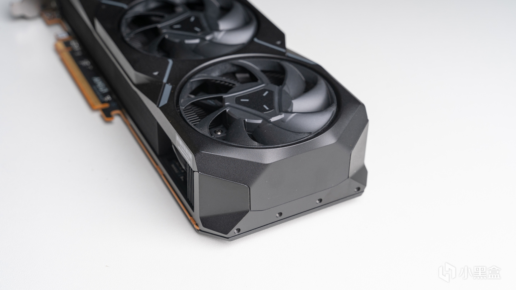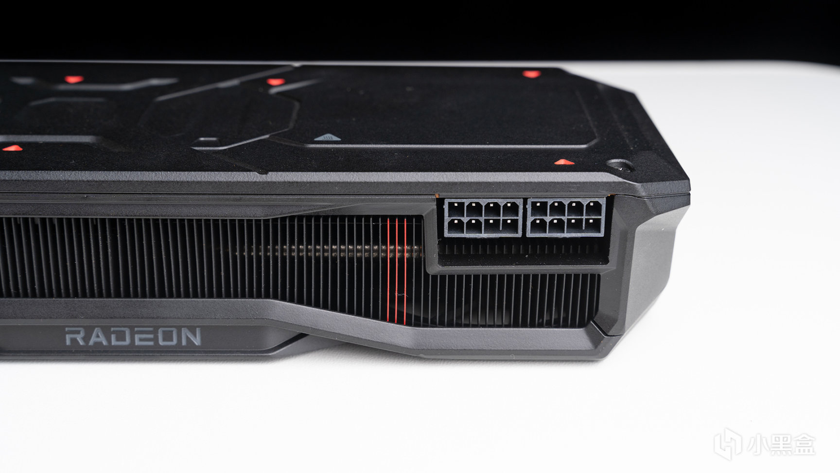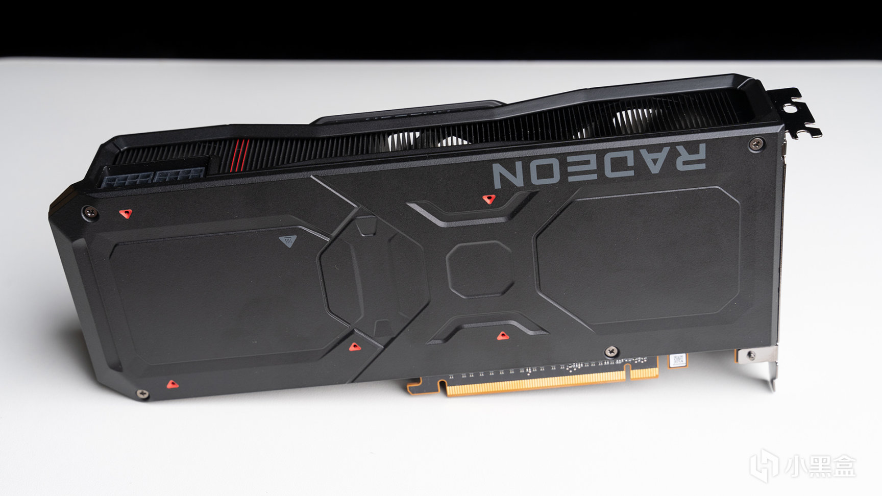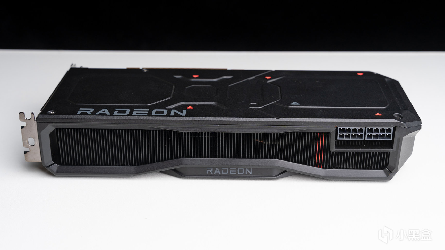 側面視角,RADEON LOGO放置在下方內凹區域,顏色從上一代的紅色變成灰色,並且沒有LED燈設計,在硬核看來這些都是爲了純黑化而妥協。