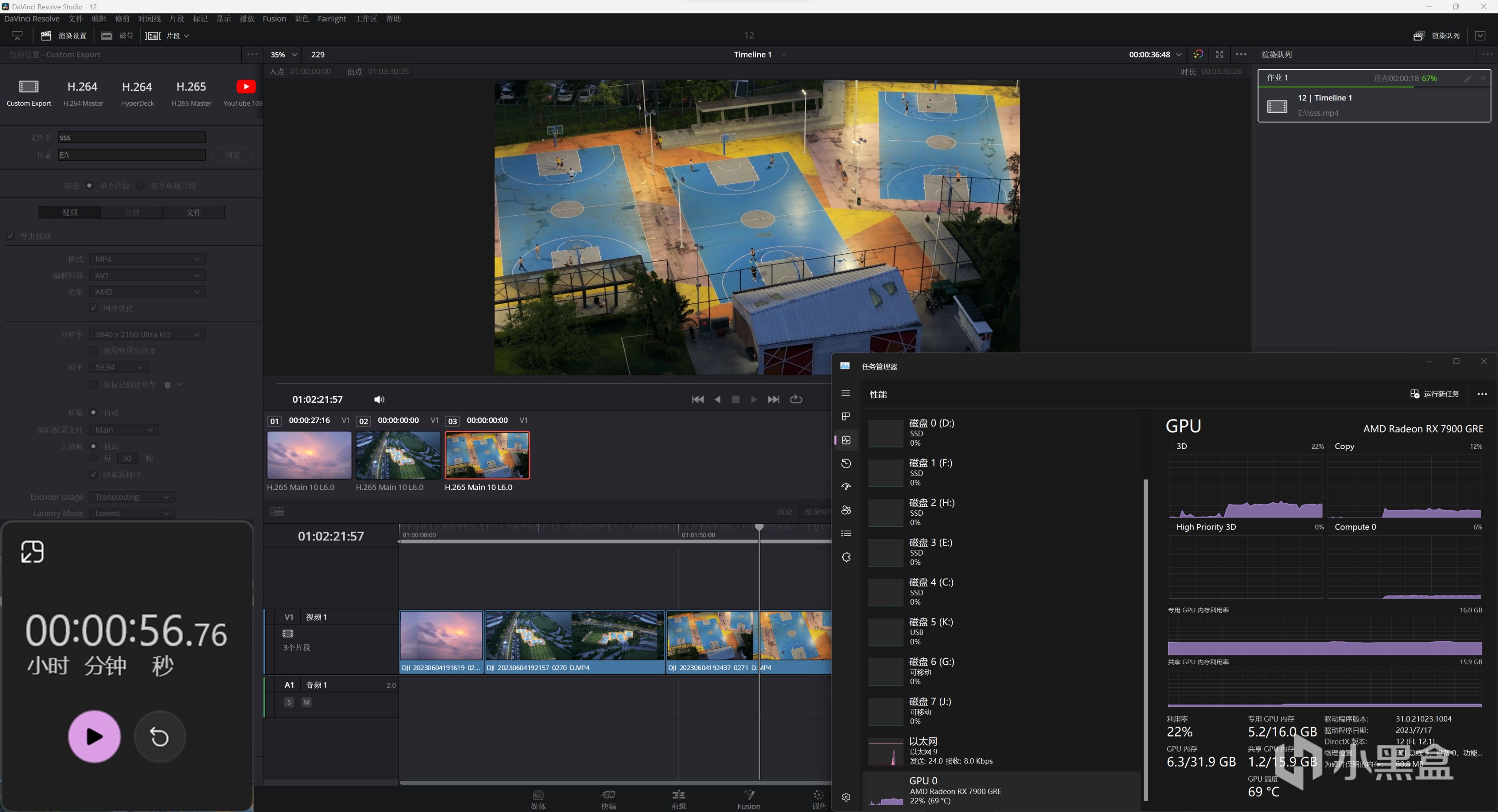 DaVinci Resolve Studio 18輸出三分半時長4K@60fps &10Bit & 200Mbps視頻,使用AV1編碼RX 7900 GRE完成時間56秒