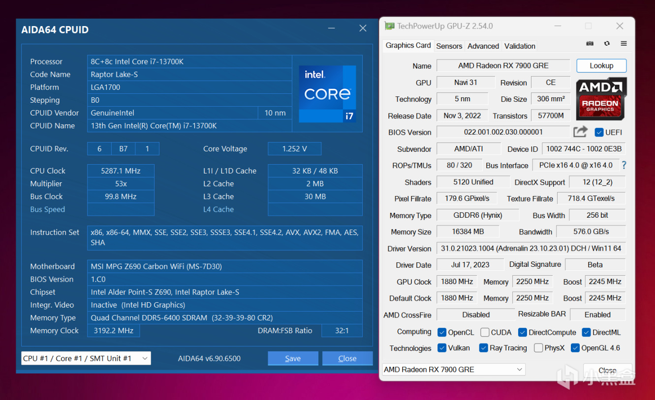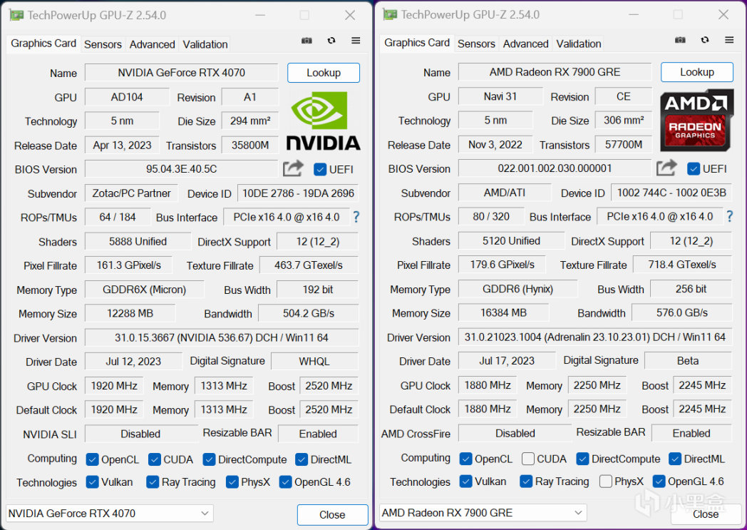 RX 7900 GRE對手就是RTX 4070,硬核也找來一款RTX 4070非公版,標稱Boost頻率爲2520MHz,理論上性能會比公版高一些。GPU-Z目前最新版本已經可以完全識別出RX 7900 GRE,顯然這貨就是Navi 31核心,測試時兩款顯卡均開啓Resizable BAR(SAM)技術再提升一些性能。