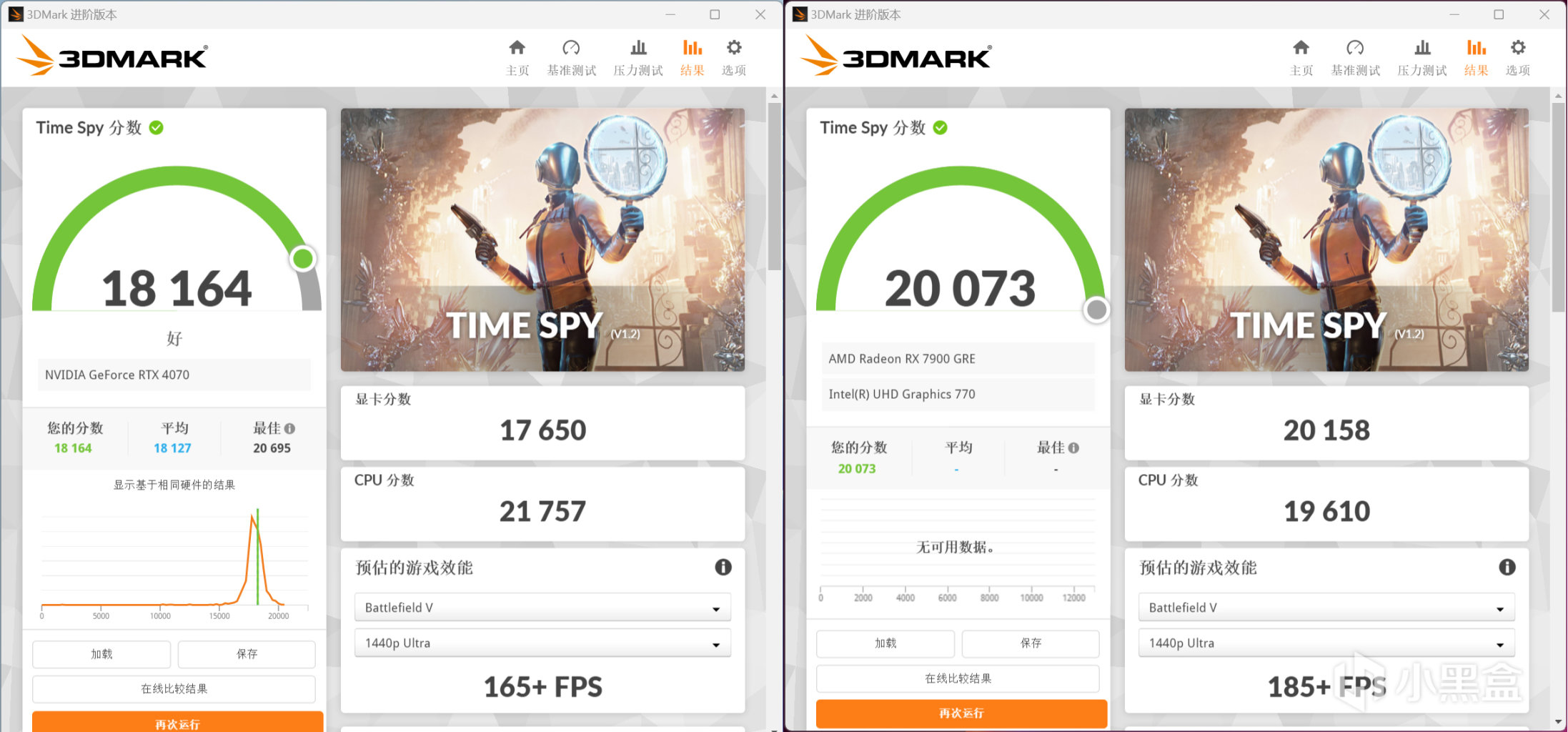 3DMark Time Spy跑分,RTX 4070顯卡分數爲17650,RX 7900 GRE顯卡分數爲20158 1