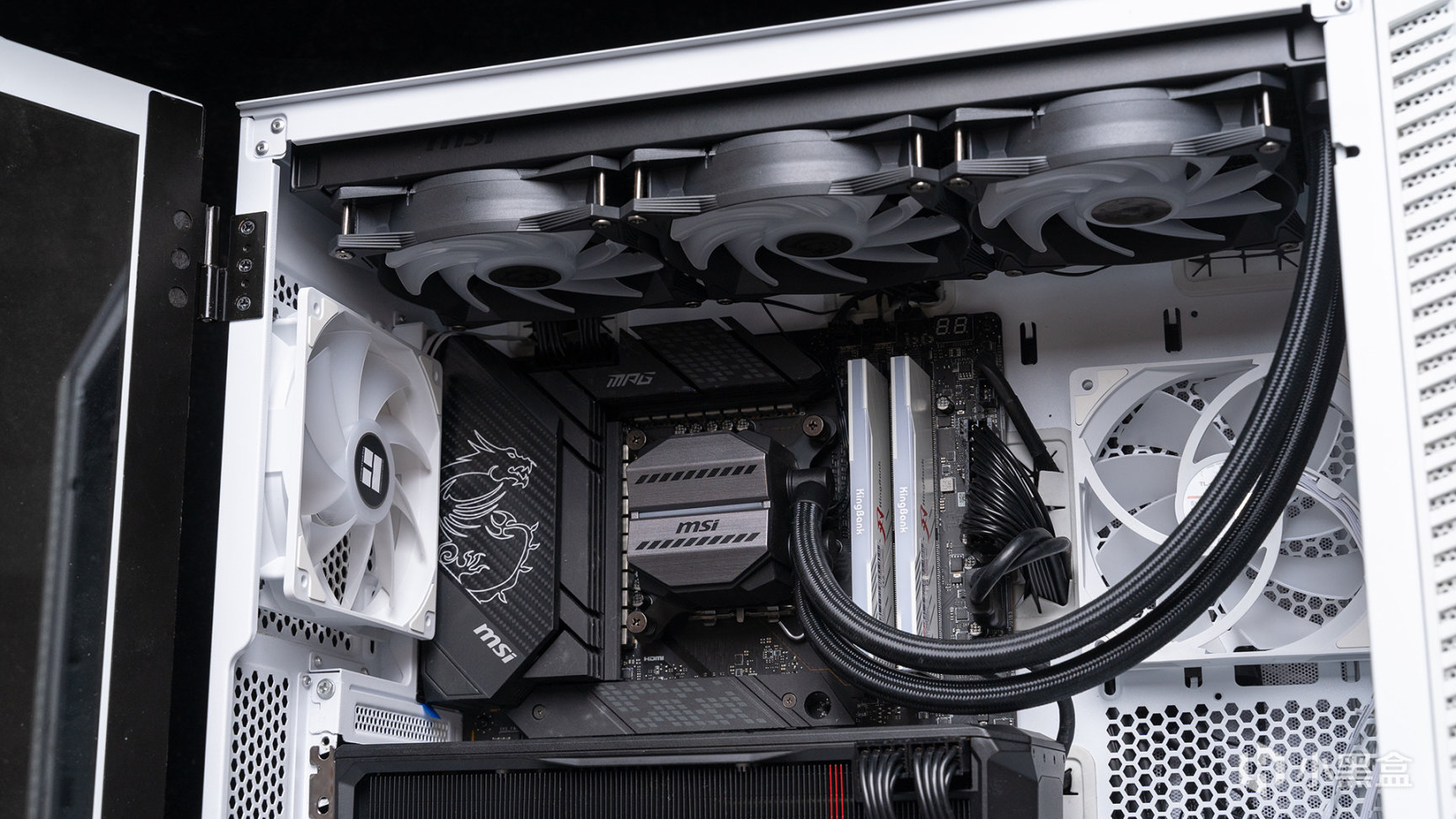 機箱頂部是微星MAG CORELIQUID迫擊炮M360水冷散熱器,水冷頭造型是迫擊炮系列的經典硬朗風格造型,通電時冷頭可以呈現一條簡約的ARGB效果,對於顯卡測試而言,CPU負載一般不高,水冷還可以充當頂部排風的作用。