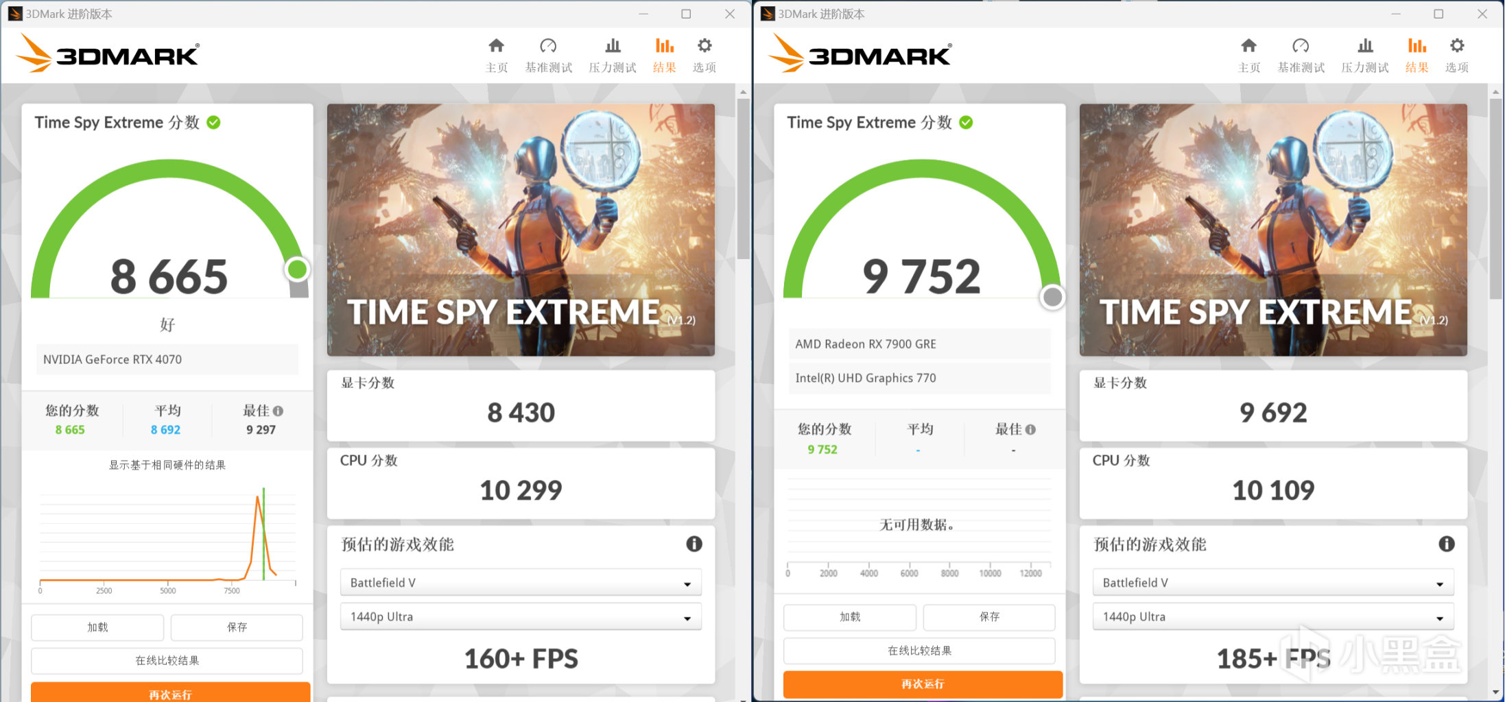 3DMark Time Spy Extreme跑分,RTX 4070顯卡分數爲8430,RX 7900 GRE顯卡分數爲9692
