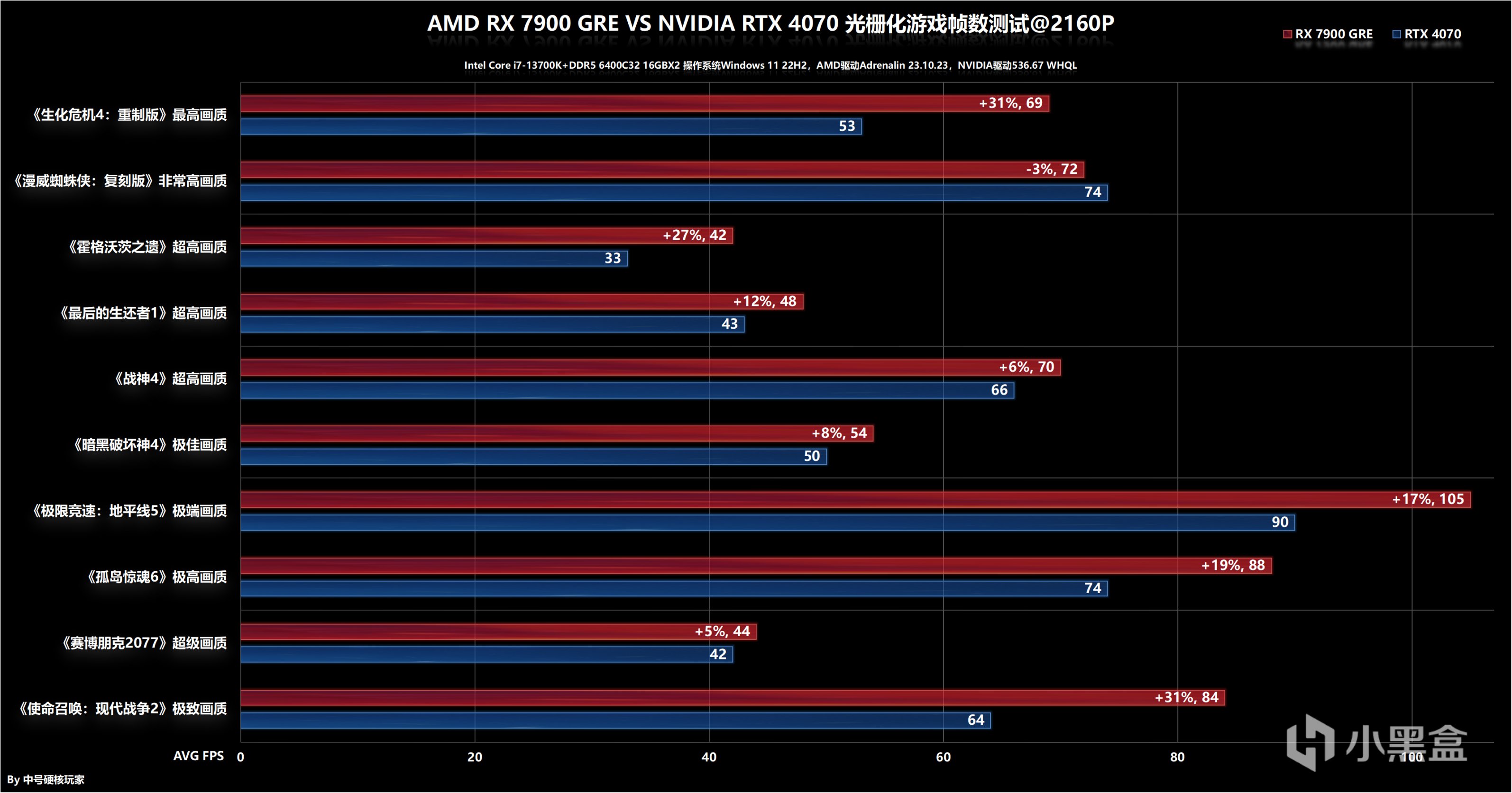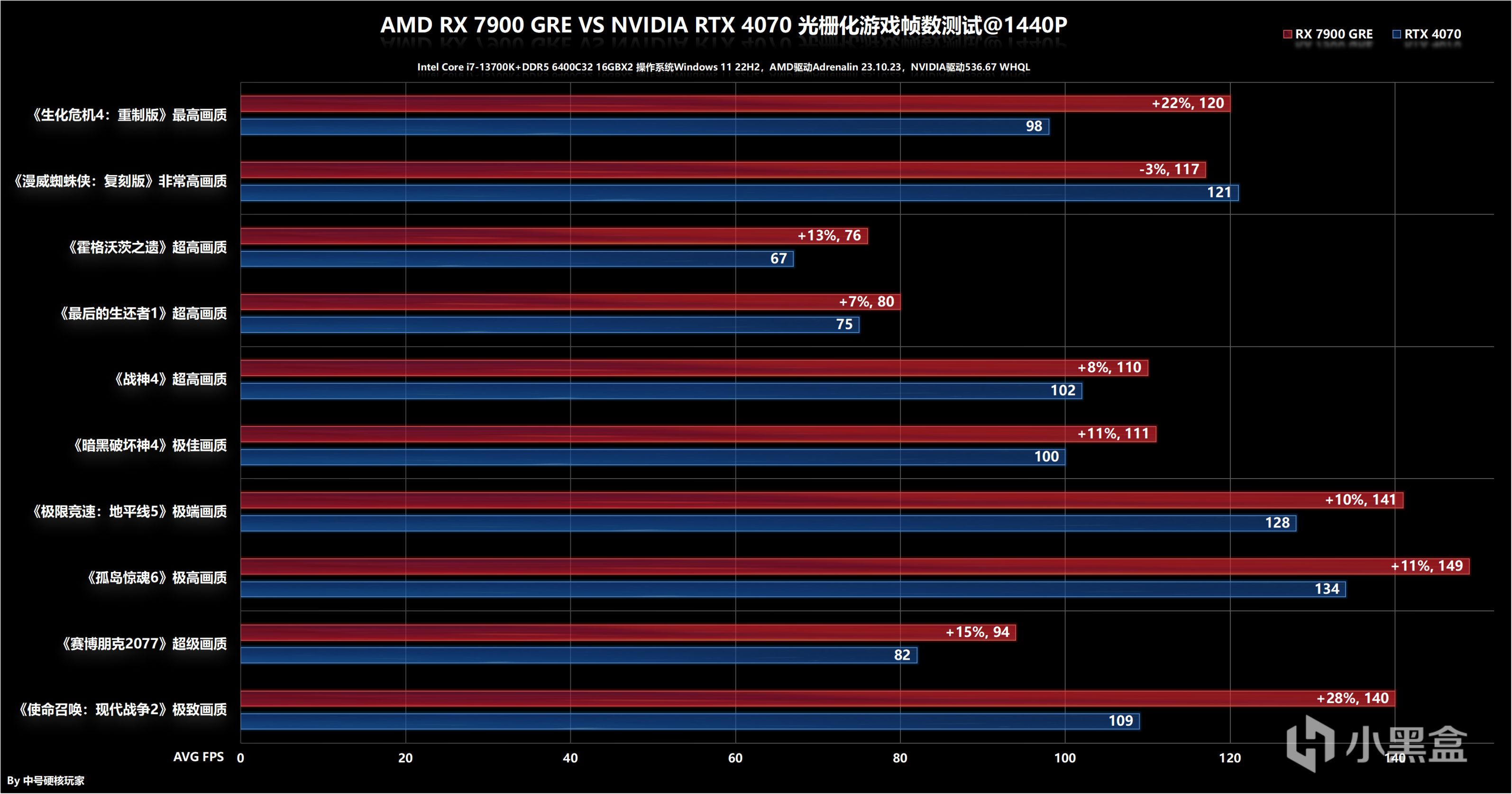 4K分辨率,對於顯存容量、位寬需求激增,在其中六款遊戲中,RTX 4070會被RX 7900 GRE擴大優勢,其中像AMD領先幅度較大的《生化危機4:重製版》和《使命召喚:現代戰爭2》,RTX 4070平均幀率只能達到50+或者60fps出頭,真正遊玩時可能會出現明顯的掉幀體驗。當然,也有部分遊戲領先幅度被縮小,像《賽博朋克2077》確實太喫顯卡了,RX 7900 GRE就甩不開差距了。