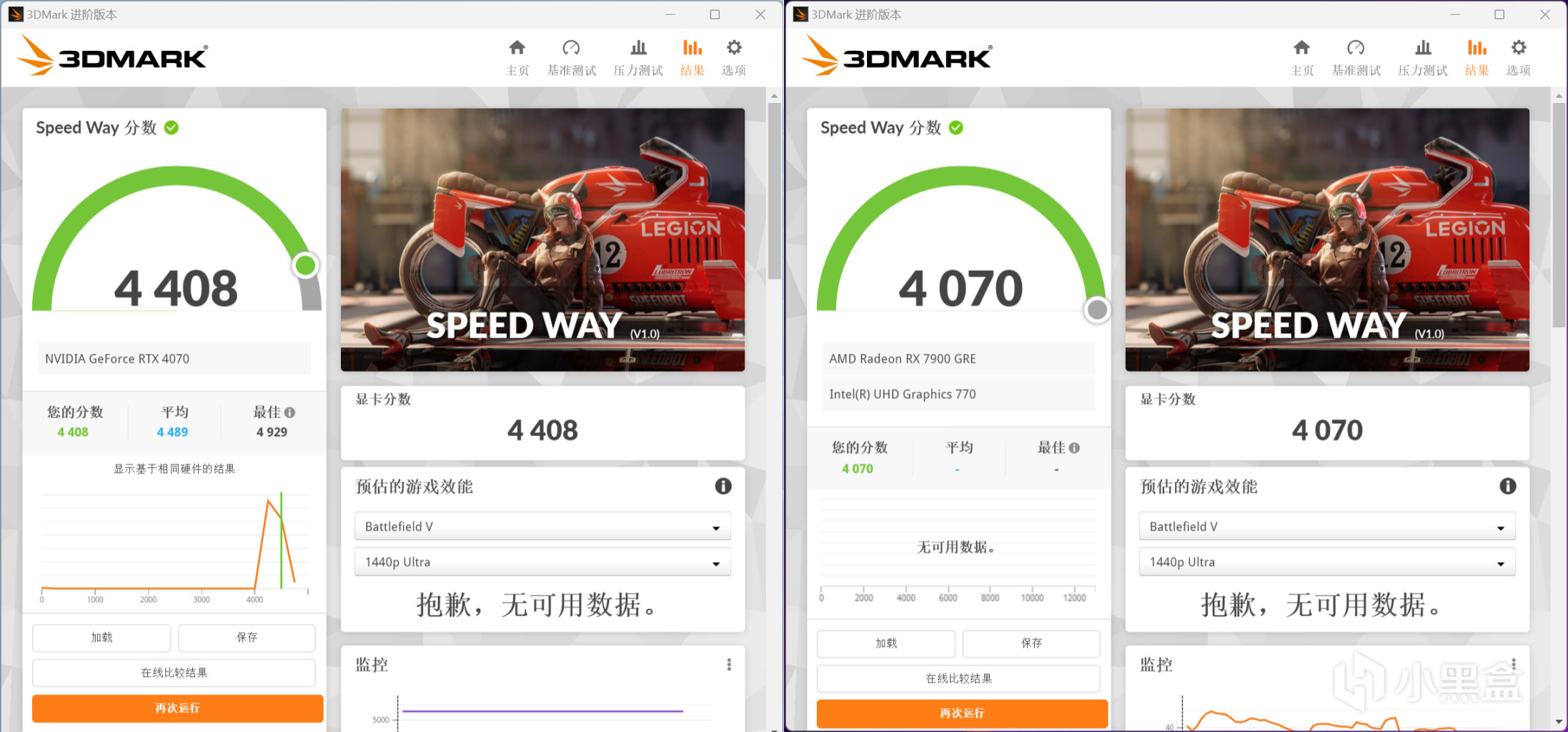 3DMark SPEED WAY跑分,RTX 4070顯卡分數爲4408,RX 7900 GRE顯卡分數爲4070