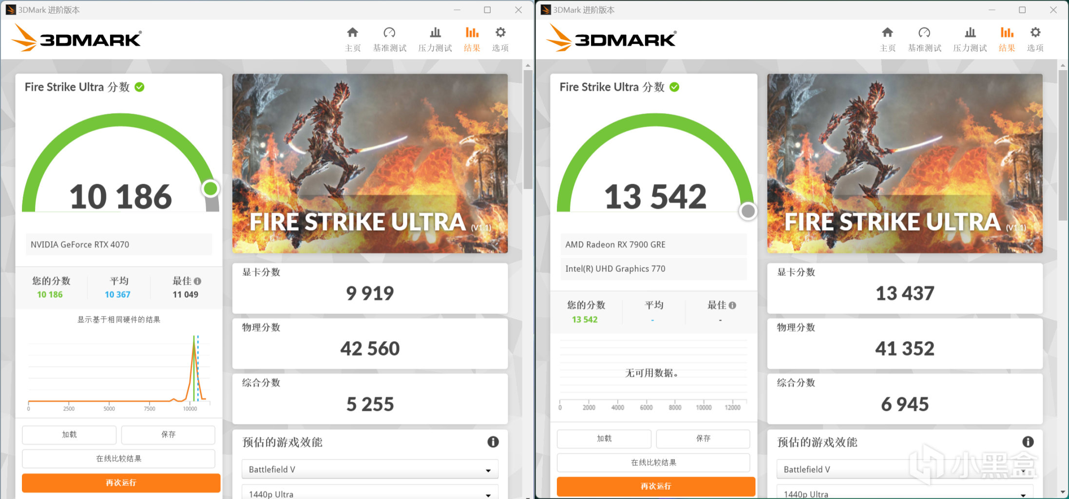 3DMark Fire Strike Ultra跑分,RTX 4070顯卡分數爲9919,RX 7900 GRE顯卡分數爲13437