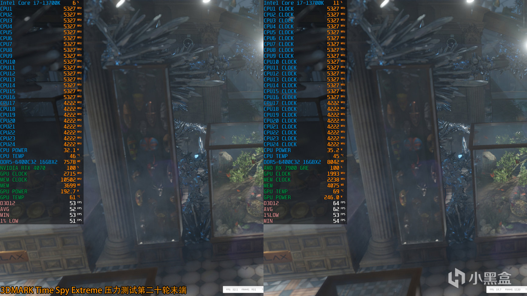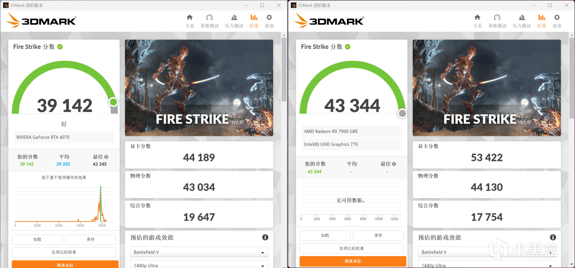 3DMark Fire Strike跑分,RTX 4070顯卡分數爲44189,RX 7900 GRE顯卡分數爲53422