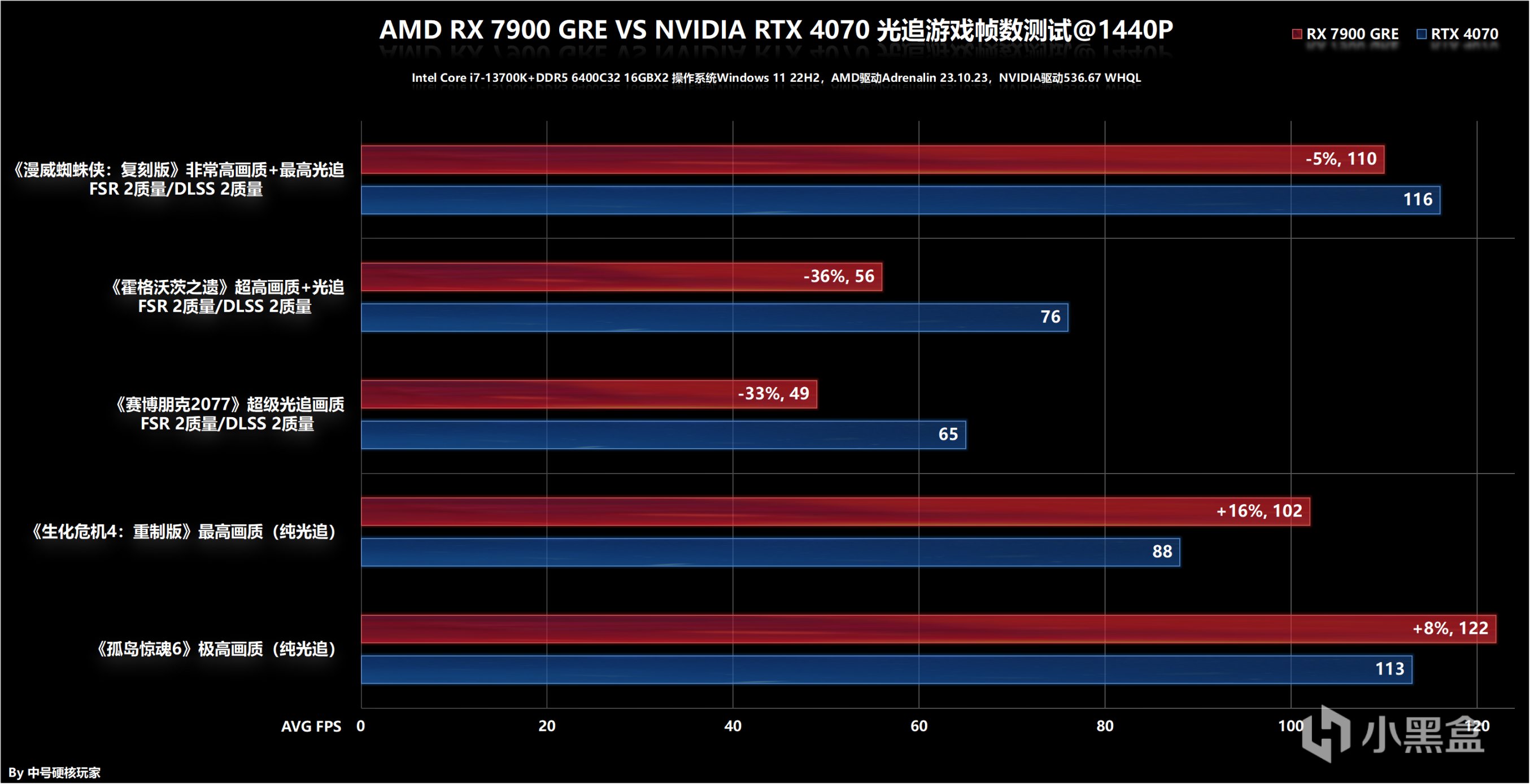 本次測試硬件和使用環境,CPU使用Intel Core i7-13700K,能最大程度降低CPU瓶頸,BIOS僅開啓DDR5 6400C32 XMP配置,操作系統是最新Windows 11 22H2,AMD顯卡驅動是Adrenalin 23.10.23,NVIDIA驅動是536.67 WHQL,前者是測試版本後者是正式版,兩者顯卡驅動都是默認設置。