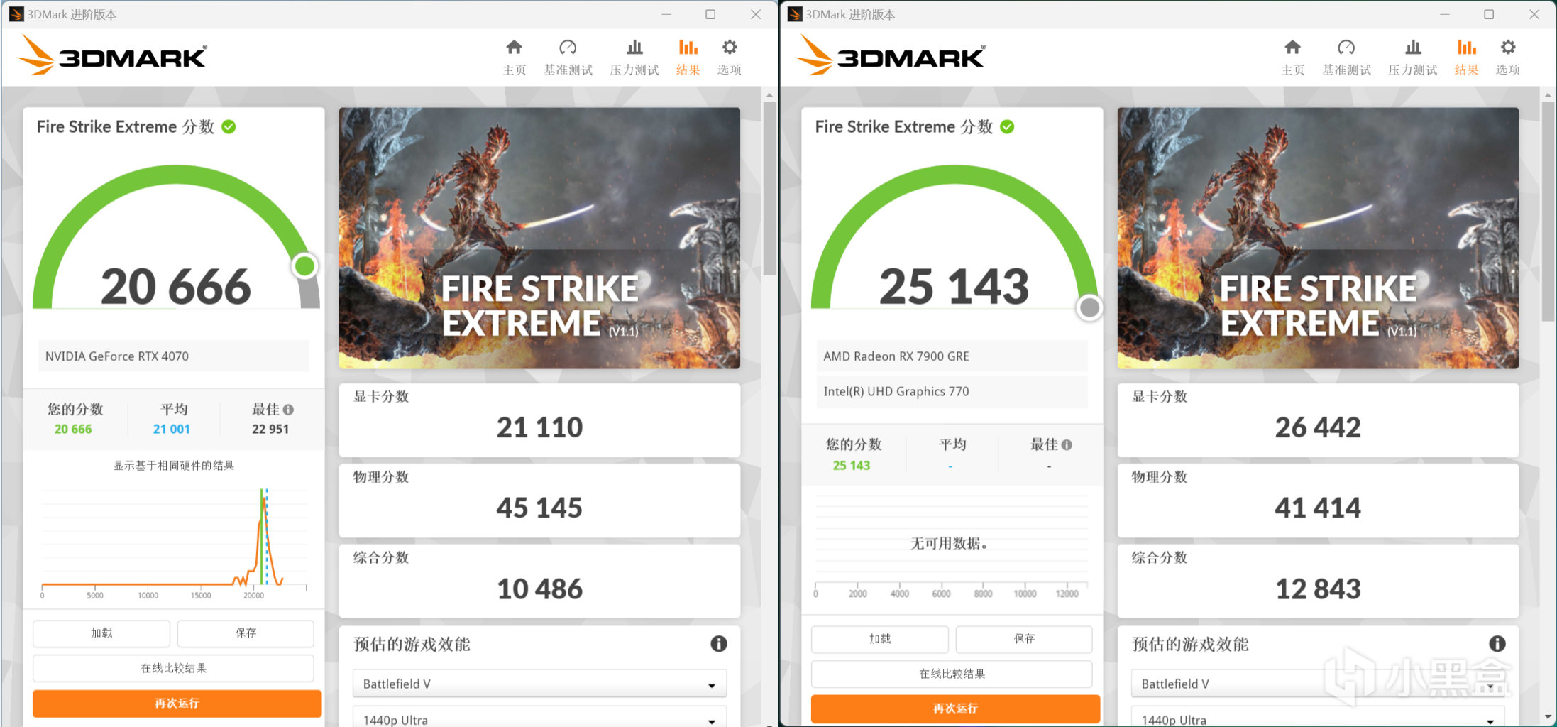 3DMark Fire Strike Extreme跑分,RTX 4070顯卡分數爲21110,RX 7900 GRE顯卡分數爲26442