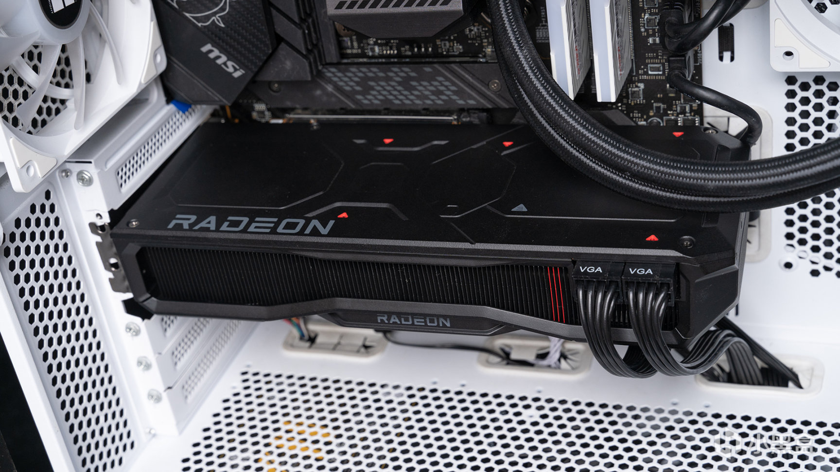 黑色背板上也有一些紅色的三角形用於點綴,而灰色的RADEON LOGO位於邊緣,除此之外背板上使用了一些簡潔線條增加層次感。值得一提的是,通常看到的GPU核心支架在這塊顯卡是位於內部,目的很簡單:爲了統一感,需要最大程度隱藏螺絲。
