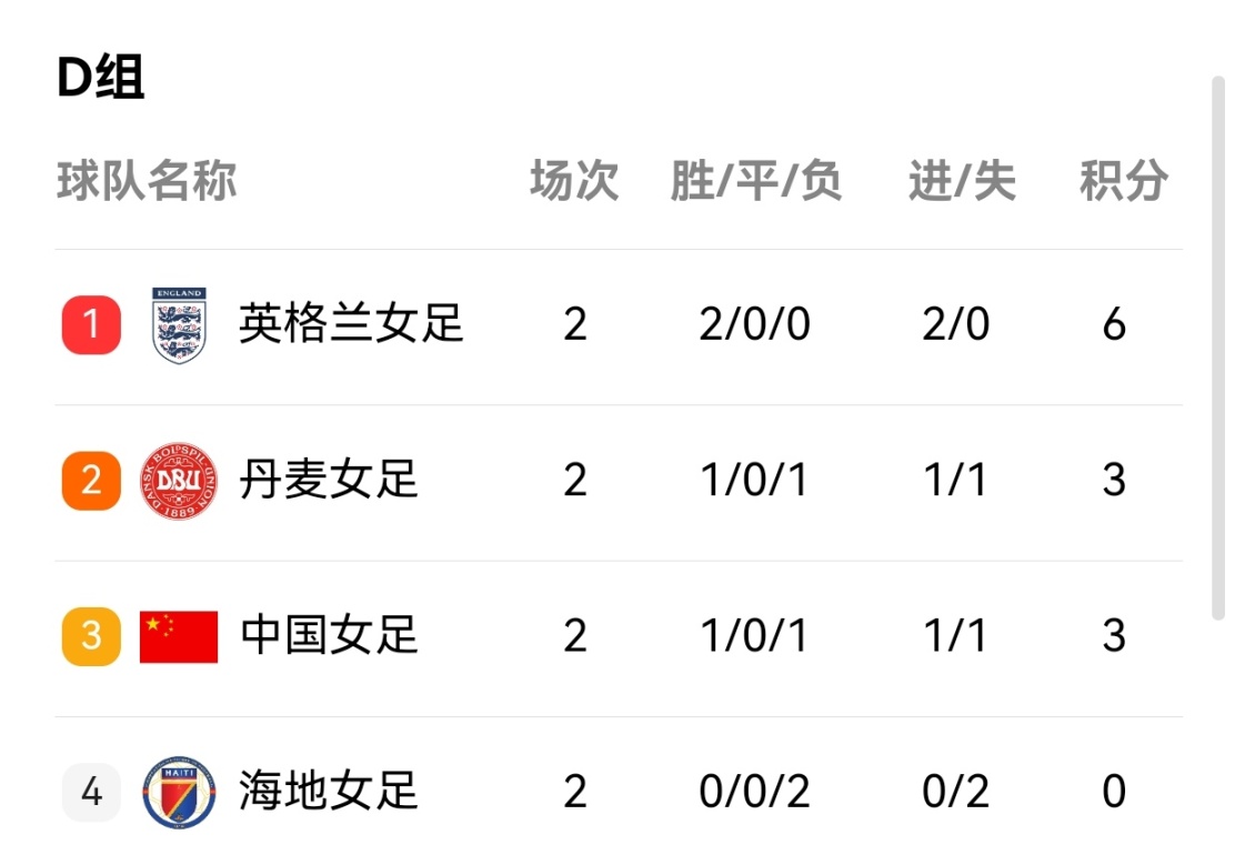 下一場比賽中國女足將迎戰實力極強的英格蘭女足,取勝就有機會小組出線進入下一階段的淘汰賽,贏了還得看淨勝球,如果淨勝球低,中國女足也會被淘汰