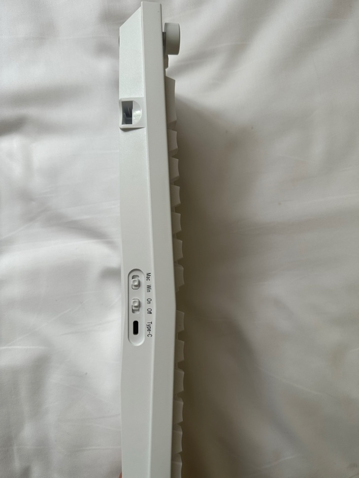 後方有一個磁吸收納器,好東西,接收器的家,然後電源開關,MAC和WIN系統切換,三模切換依靠快捷鍵,講真第一次我也找了好久