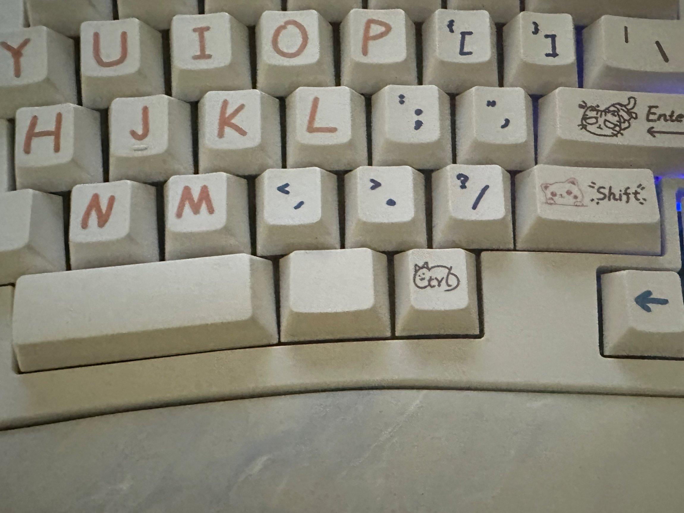 個人用的比較混雜,把以前剩下的軸全用上了,字母區全是灰木V3,然後其他的部分是水蜜桃和青檸交替,大鍵用的是BOX白軸