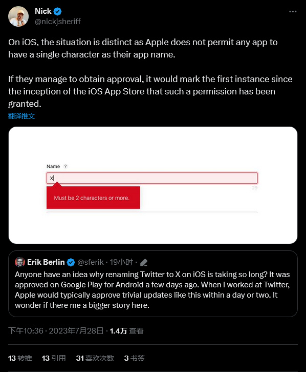 產品設計師 Nick Sheriff 在推特上指出,在 iOS 上蘋果不允許任何應用使用單個字符作爲命名。但是如果該公司獲得批准,將標誌着自蘋果應用商店成立以來某家公司首次獲得此類許可。