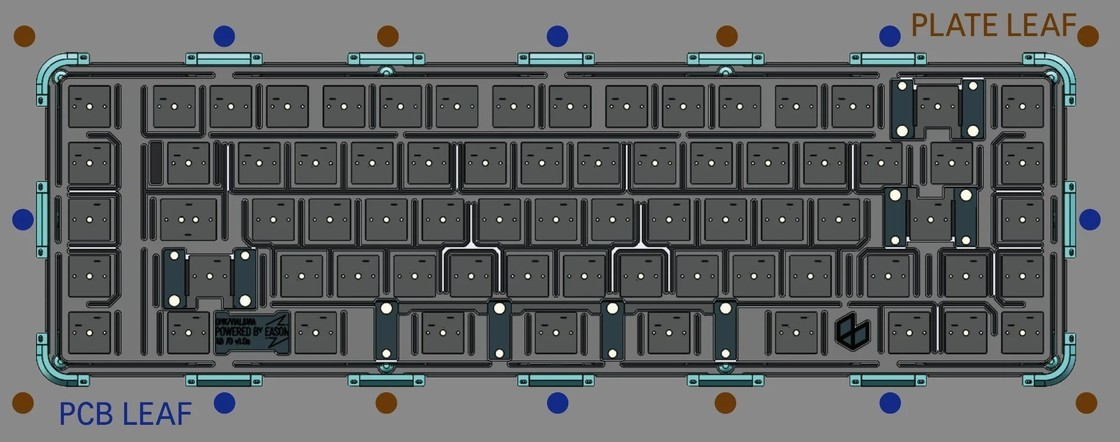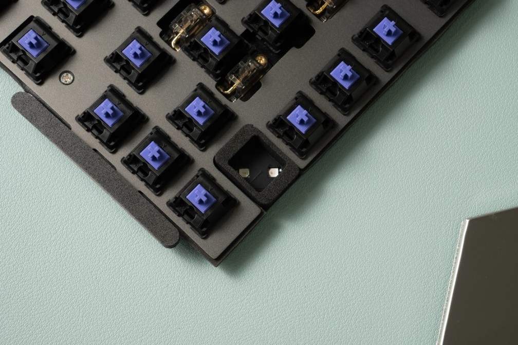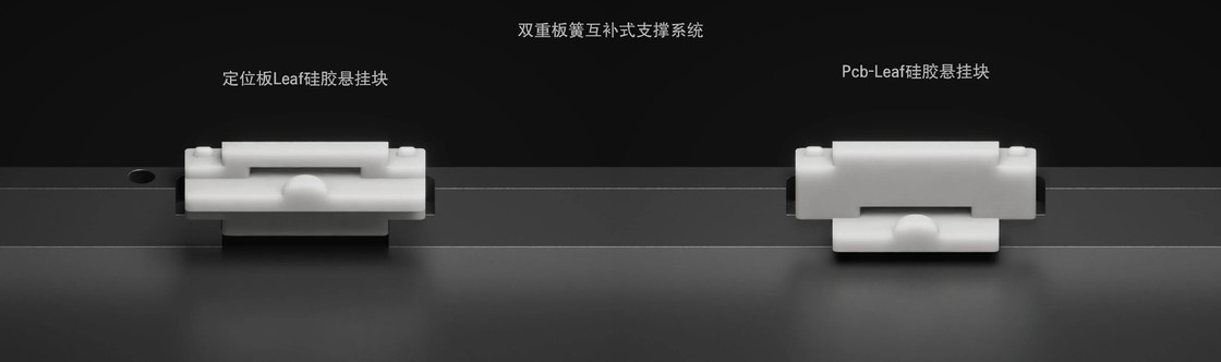 内胆方面,这次的设计还是蛮有说法的,虽然说是Leaf spring板簧结构,但AB70在PCB和定位板上都做了固定点,以及两种硬度和弹性的硅胶块,硅胶块采用底部不触底的悬挂方式嵌套定位板和PCB突出部分,获得在Leaf基础上更好的内胆整体弹性。