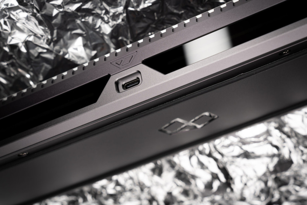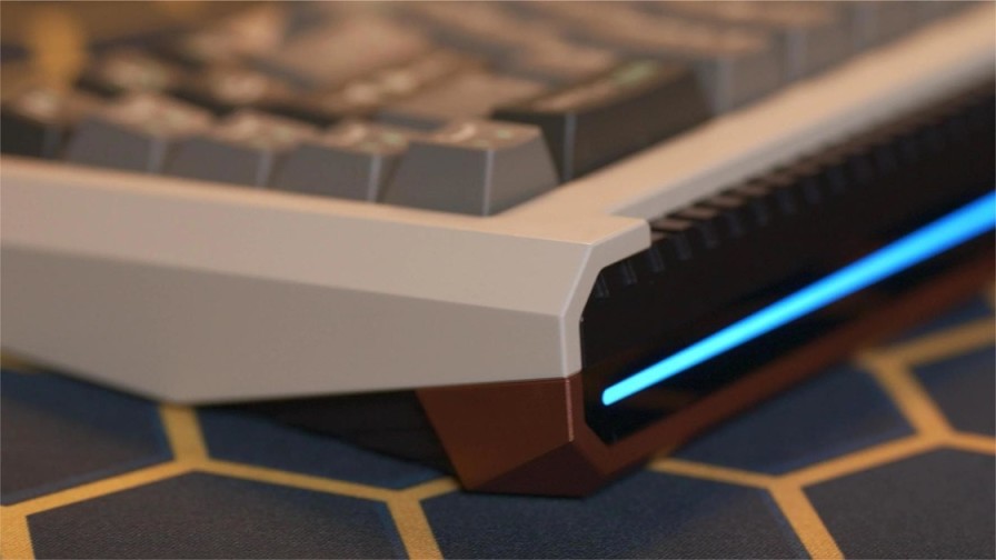老六说键盘的灵感来源于上世纪70-90s年代电影里科幻和工业风的硬直线条和栅格元素,实际看来整把键盘的设计走向确实是比较好地表达了这种想法,处处都是硬郎的线条,丝毫不拖泥带水。键盘正面使用棱角分明的大倒角设计,顶部做了一个大条的内凹露出栅格组件,再配上尾部的RGB,颇有散热器的既视感。不锈钢配列隔断条则是在视觉上充当一个平衡点,减少对双门牙对称的视觉干扰。
