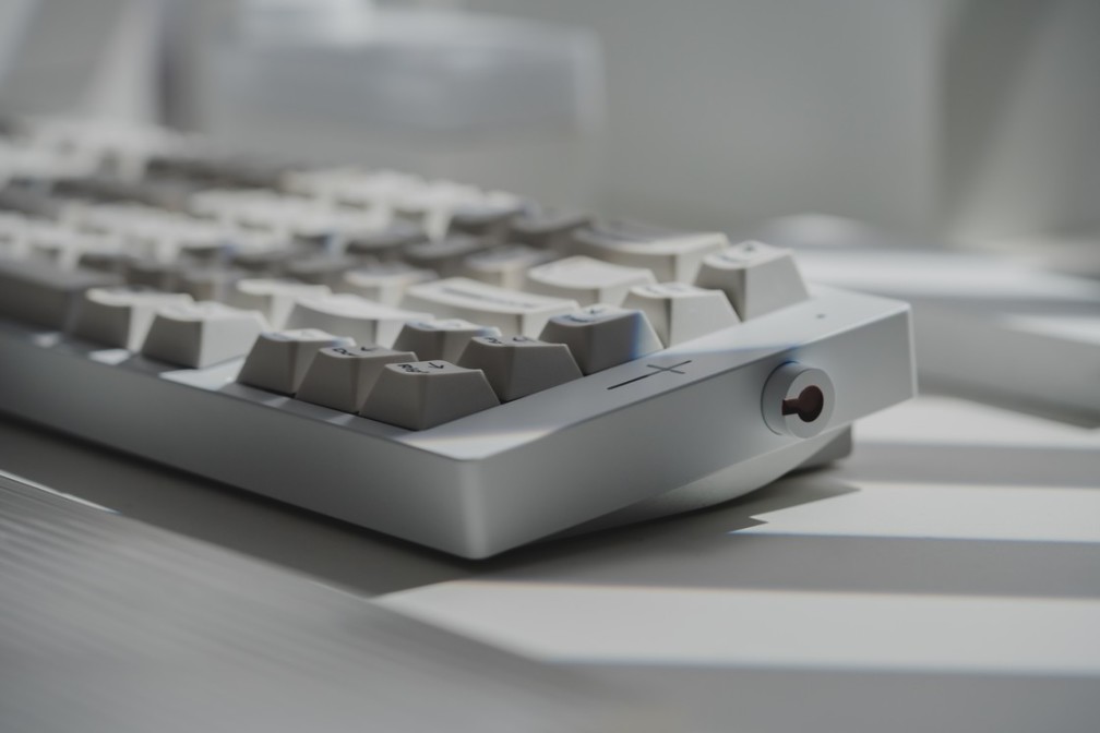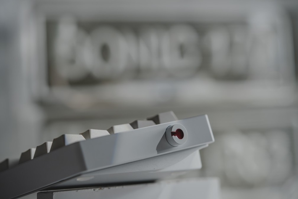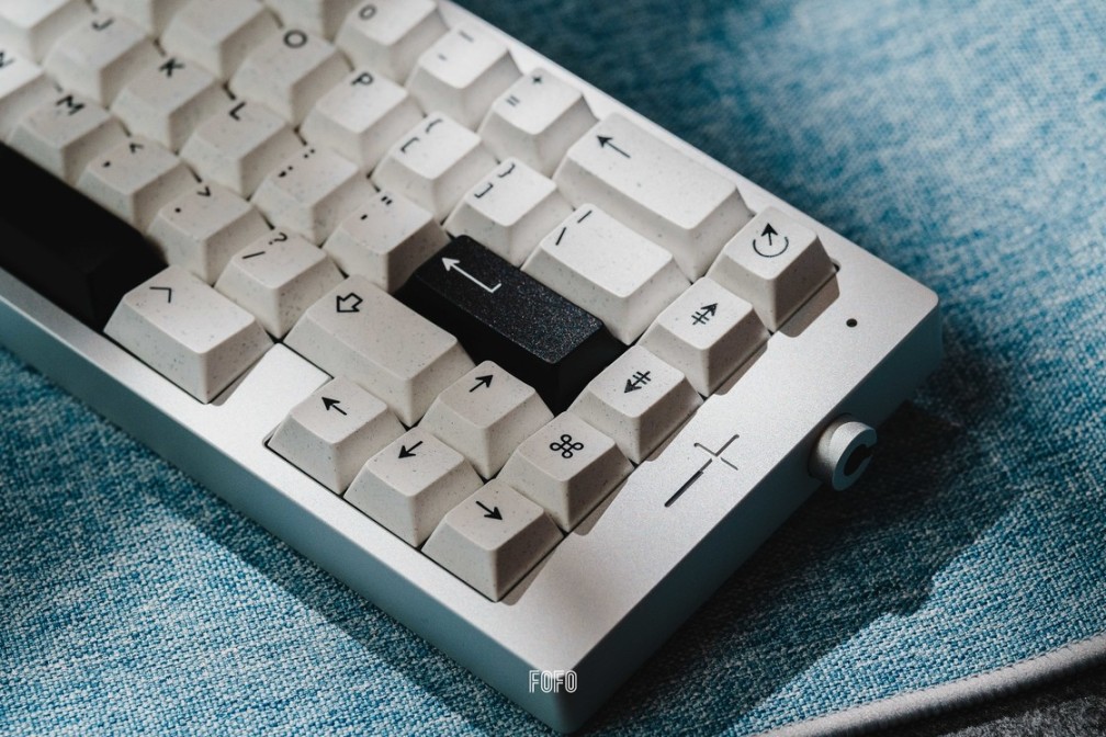 旋钮也是这把键盘的特色之一,借助右侧边框的加厚,旋钮被巧妙地整合到键盘的右侧边框中,侧面旋钮算是一个不会破坏键盘正面观感的好选择,不过对于加工各方面要求就更高了,同时旋钮的手感和稳定性也非常重要,希望成品能做好这些地方,细节决定成败。