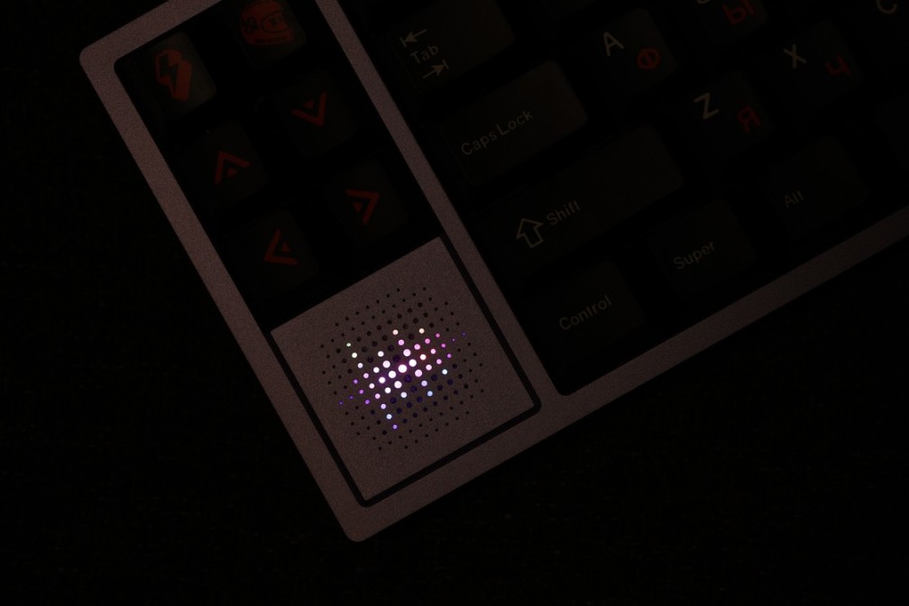 同时这把键盘的灯光架设也值得一提。设计师保留了原始灵感来自OP-1的左上角灯光块,通过透光孔的设计,使其在关闭灯光的状态下仍然具有呼吸感和立体感。灯光模块可以根据个人喜好自由选择放置在键盘的上部或下部。此外,左侧的宏按键区可以替换为10U的全键位形态。