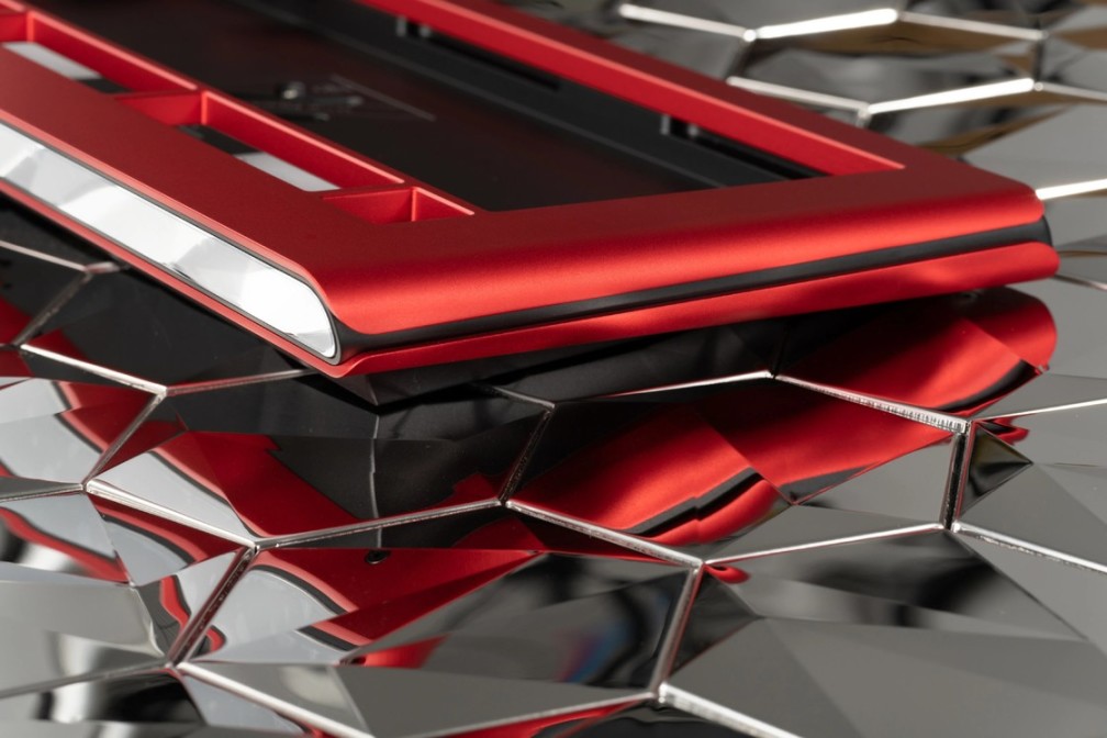 而这次的AB70同样也是极有辨识度的外观设计,但不同于之前AXE60的着重于侧面和堆叠构成的设计语言,AB70的设计是一体化程度极高的,在键盘的后面运用了栅格、黑色玻璃搭配上下拼色,使得整体的立体感非常强,用硬朗的线条将这些元素分割开来,繁而不杂,整体是完全对称的设计,给人一种十分强的秩序感。